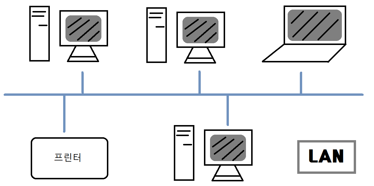 예) 사무실이나 가정과 같이 지리적으로 제한된 곳에서 컴퓨터, Tv, 노트북, 프린터 등을 연결