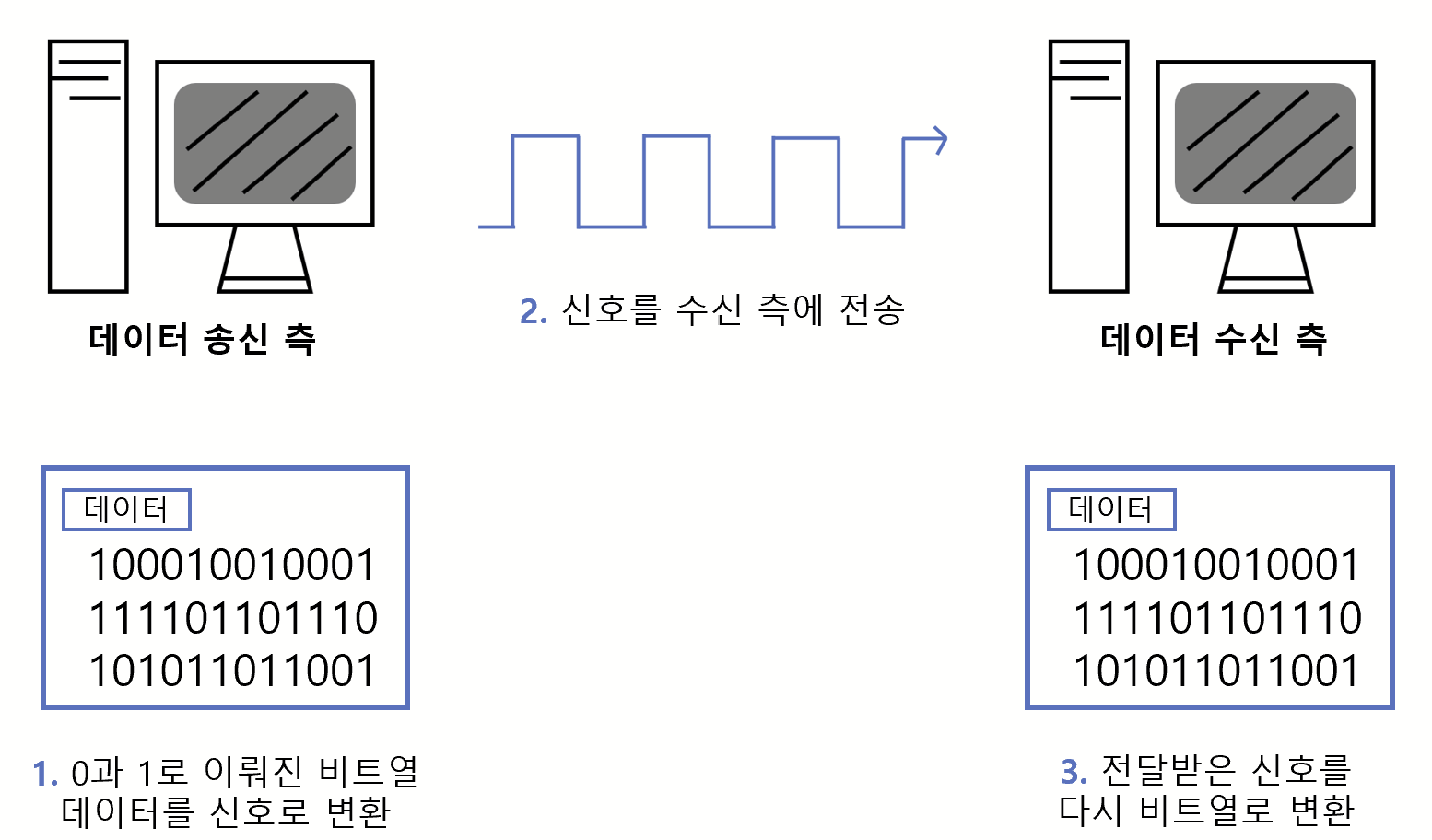 전기 신호는 전압이 일정 패턴으로 변하여 생기는 일련의 흐름으로 전압의 변화가 모여서 만들어진 신호다. 이러한 전기 신호를 주고받음으로써 네트워크에서 사진이나 문서 등을 주고 받을 수 있는 것이다.