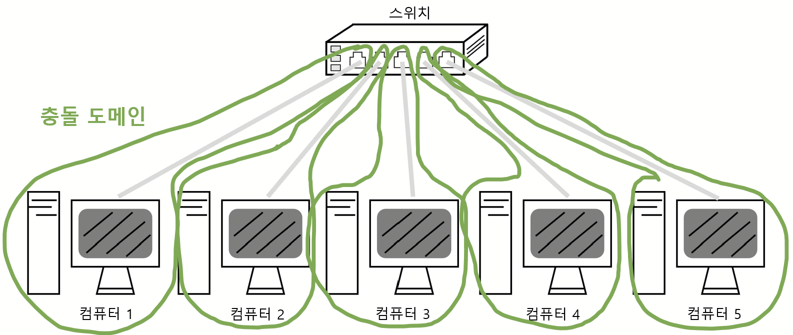 허브는 연결되어 있는 컴퓨터 전체가 하나의 충돌 도메인이 된다. 즉 충돌의 영향이 모든 컴퓨터에 미치게 된다.