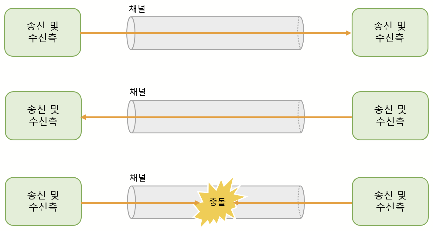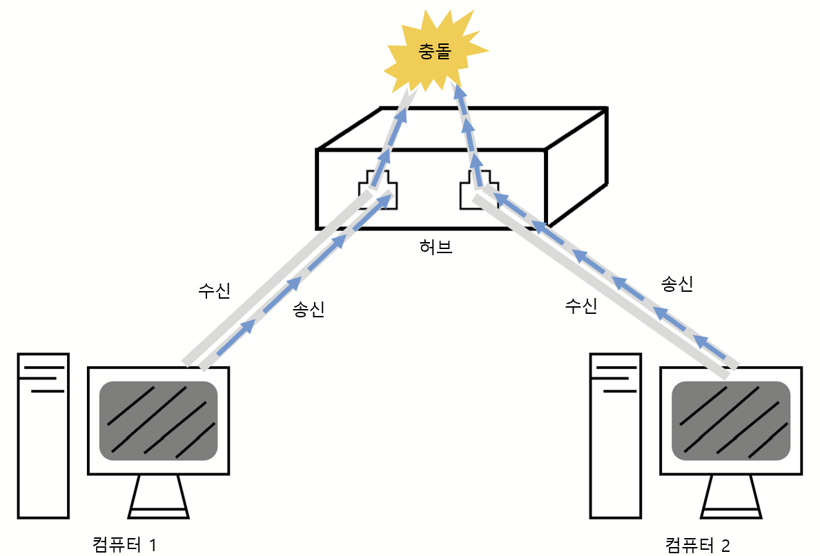 - 하지만 동시에 송신을 하게 되면 전송로에서 충돌이 발생한다.