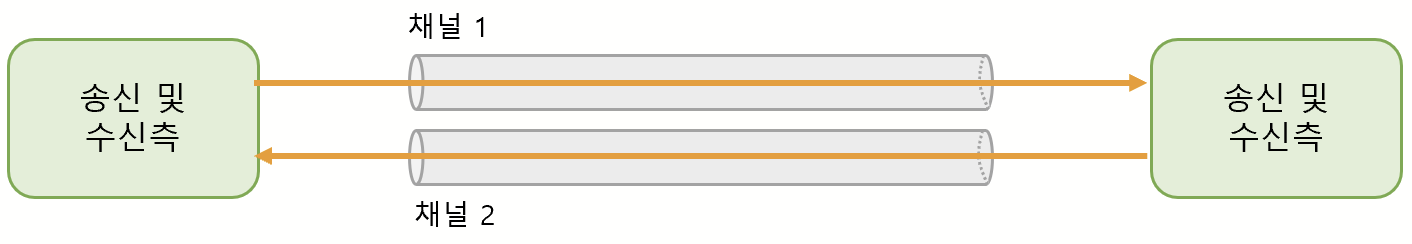 - 송신과 수신 회선이 따로 있어, 양쪽에서 동시에 송수신이 가능한 통신 방식