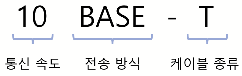 이름의 가장 앞의 숫자는 통신 속도를 나타내며 BASE는 BASEBAND 라는 전송 방식을, T는 케이블의 종류를 나타낸다.