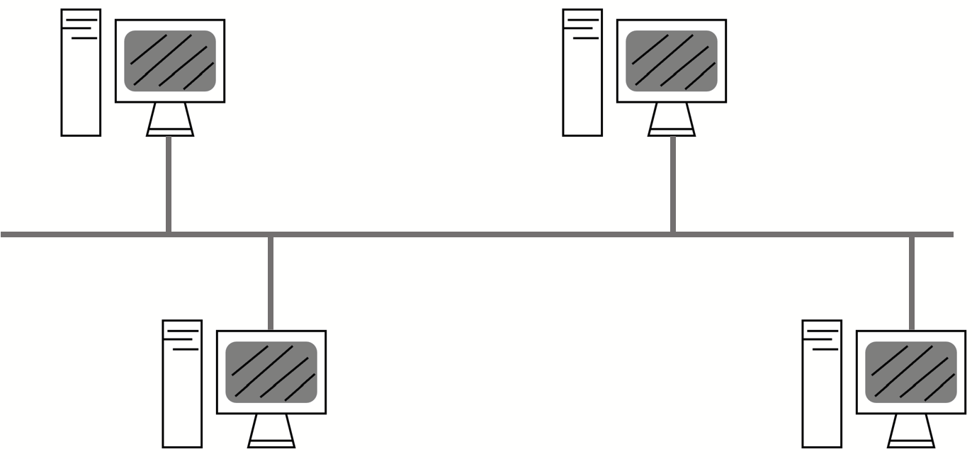 - 버스 구조는 하나의 긴 케이블(통신 회선)이 네트워크 상의 모든 장치를 연결하고 있어 하나의 컴퓨터가 데이터를 전송하면 연결된 모든 컴퓨터다 수신하는 특징을 가진다.