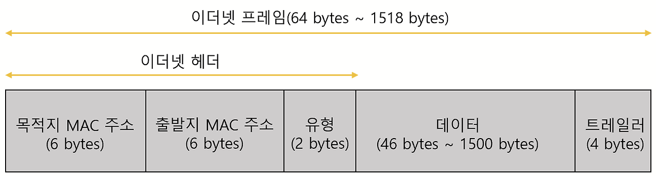 - 프레임에은 출발지 컴퓨터의 MAC 주소, 데이터를 수신할 목적지 컴퓨터의 MAC 주소, 프로토콜의 종류를 식별하는 유형과 데이터의 전송 중 오류 판별을 위한 트레일러가 데이터에 추가된 모습이다.