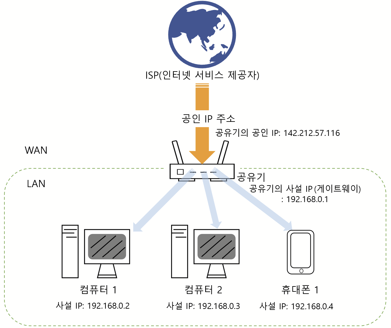 가정이나 회사 내 공유기 / 라우터 등의 장비가 ISP로부터 하나의 공인 IP 주소를 할당받으며 공유기에 연결된 컴퓨터, 휴대폰 등의 장치들은 사설 IP 주소를 각각 할당 받아 인터넷에 접속할 수 있게 된다. 이 사설 IP 주소는 공유기가 로컬 내에서만 사용할 수 있도록 생성한 IP라 외부에서 식별이 불가능하다. (= 즉 사설 IP주소만으로는 인터넷에 직접적으로 접속할 수 없으며 인터넷에서는 외부 접근이 가능한 공인 IP 주소만 인식이 가능하다.)