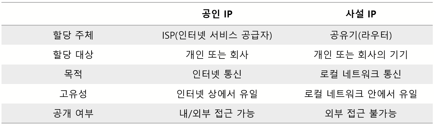 IP 주소에는 공인 IP 주소와 사설 IP 주소가 있다.