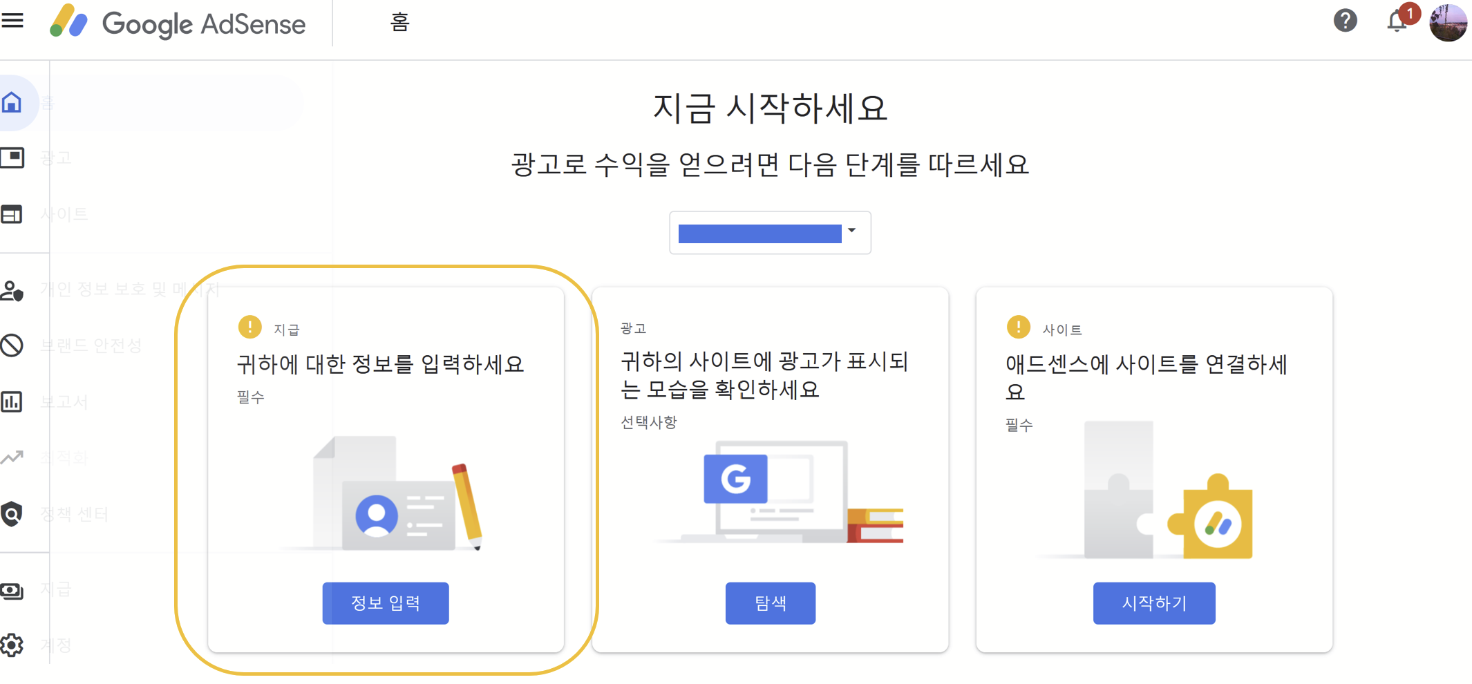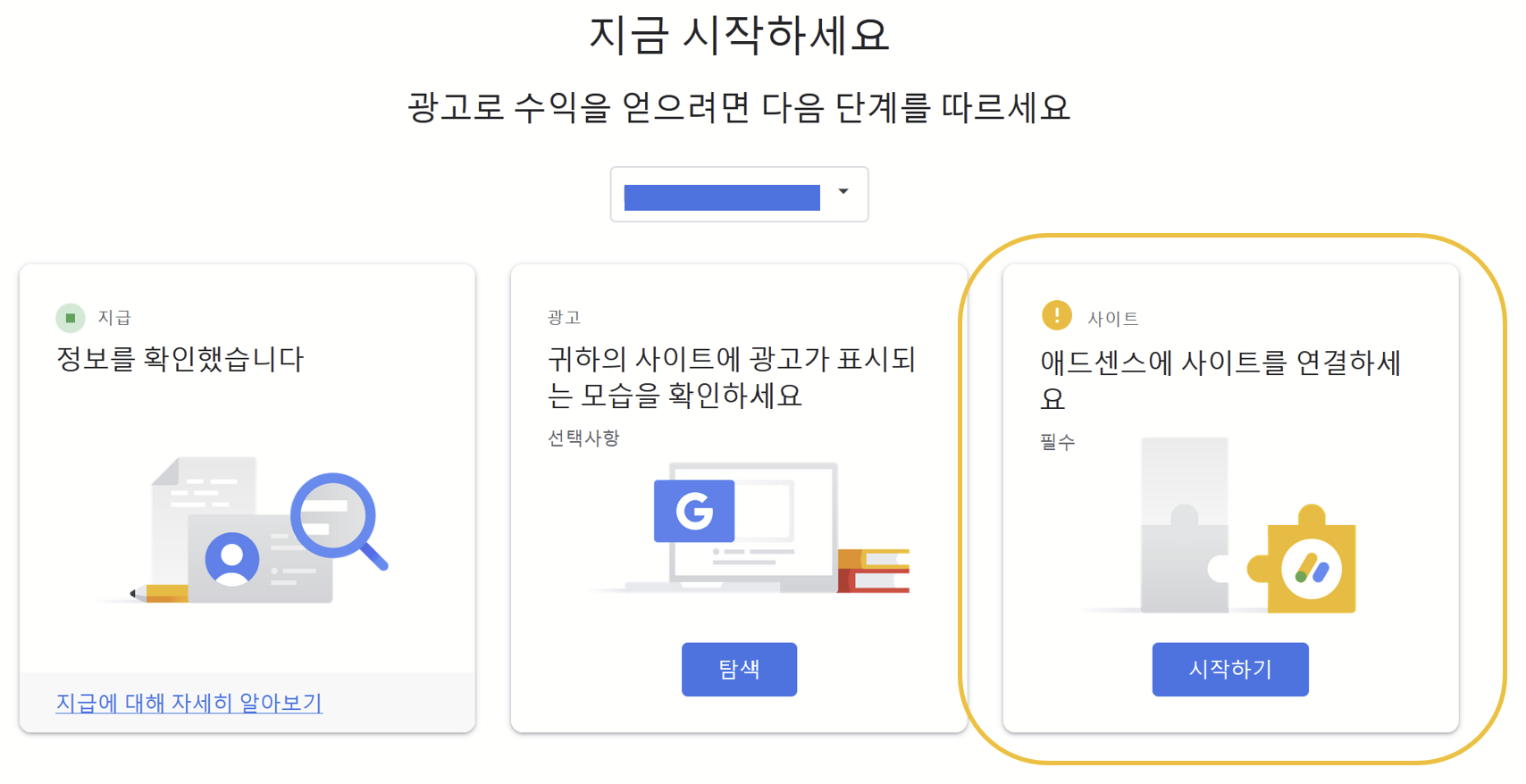 6). 애드센스에 사이트를 연결을 위해, 홈 화면으로 돌아와 우측의 시작하기 버튼 클릭