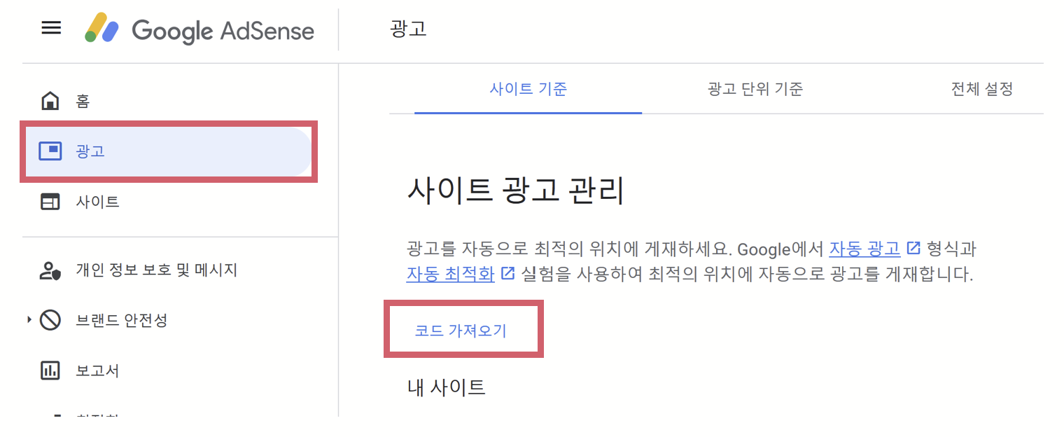 1). 최적의 위치에 자동으로 광고를 달고 싶다면 구글 애드센스로 들어가 광고 탭에서 '코드 가져오기'를 눌러준다.