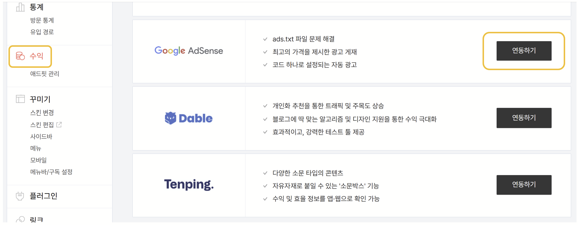 8). 티스토리 관리 페이지로 들어가 수익 카테고리 클릭 후, 구글 애드센스 연동하기 선택