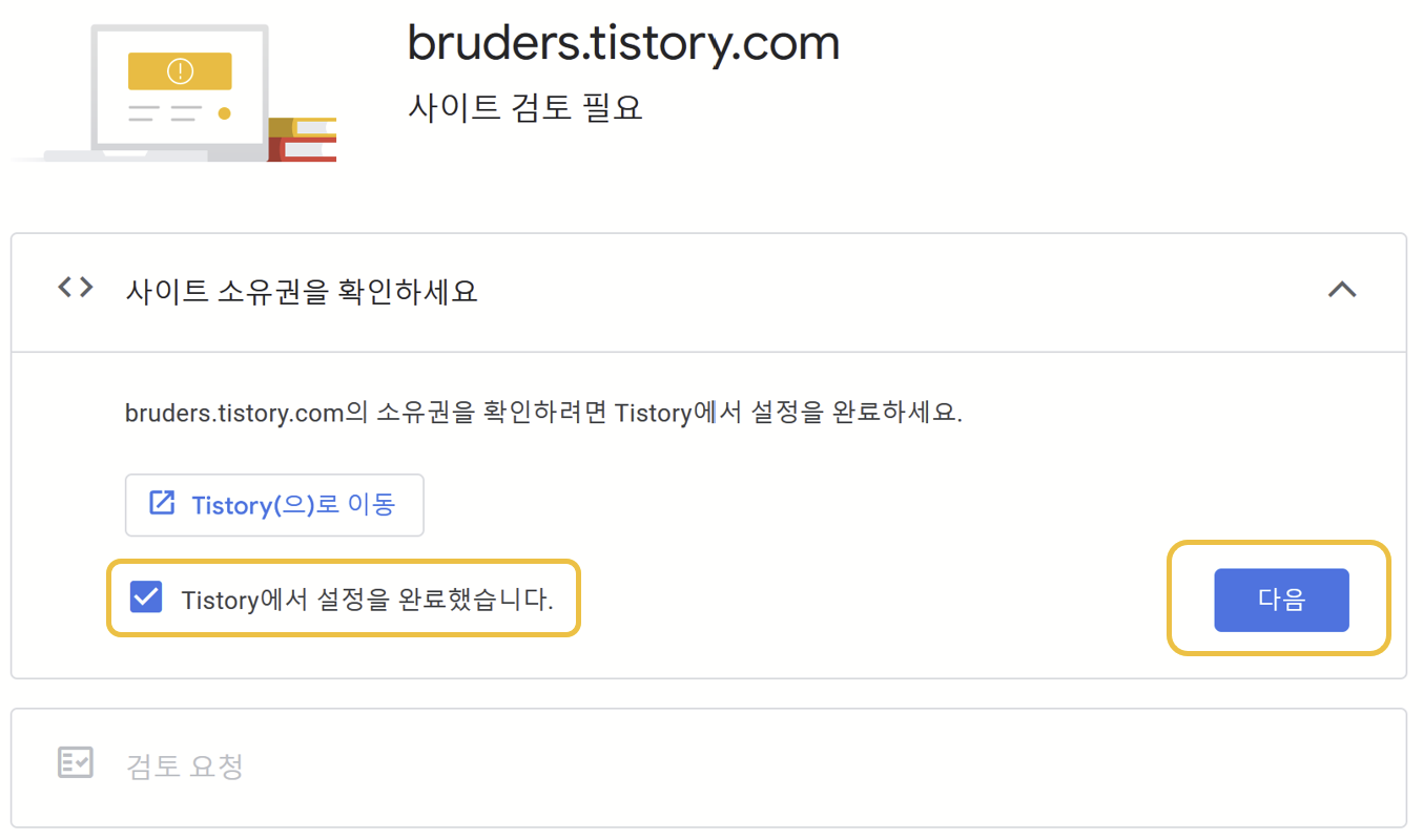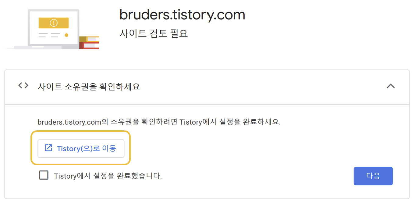 12). 아까 이동하기를 눌렀던 창으로 돌아와 Tistory에서 설정을 완료했다고 체크 후, 다음 버튼 클릭