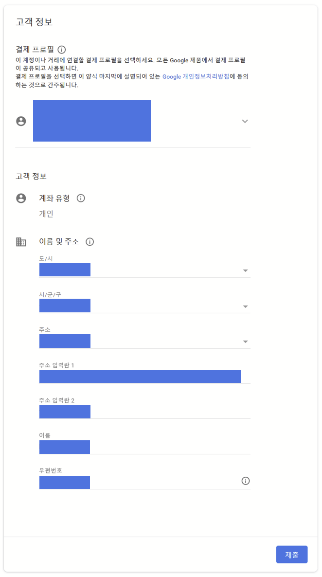 5). 주소 및 이름 등의 개인 정보 입력 후, 제출 클릭