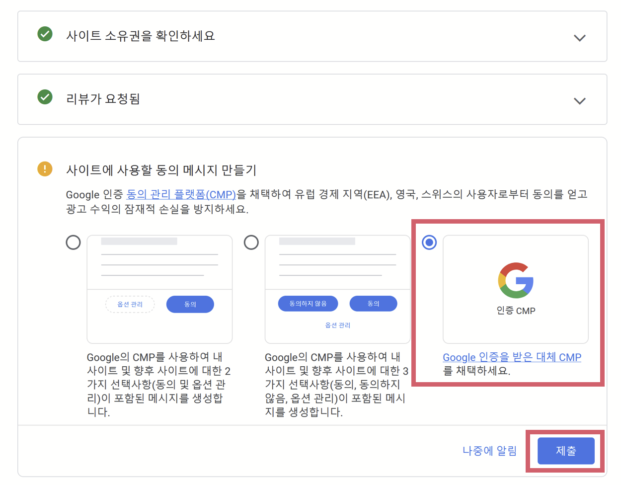최근엔 애드센스 신청 시 CMP 관련 설정을 선택하게 나오는데 그냥 간단하게 '구글 인증을 받은 대체 CMP 채택' 옵션을 선택하고 제출을 눌러주면 됩니다.
