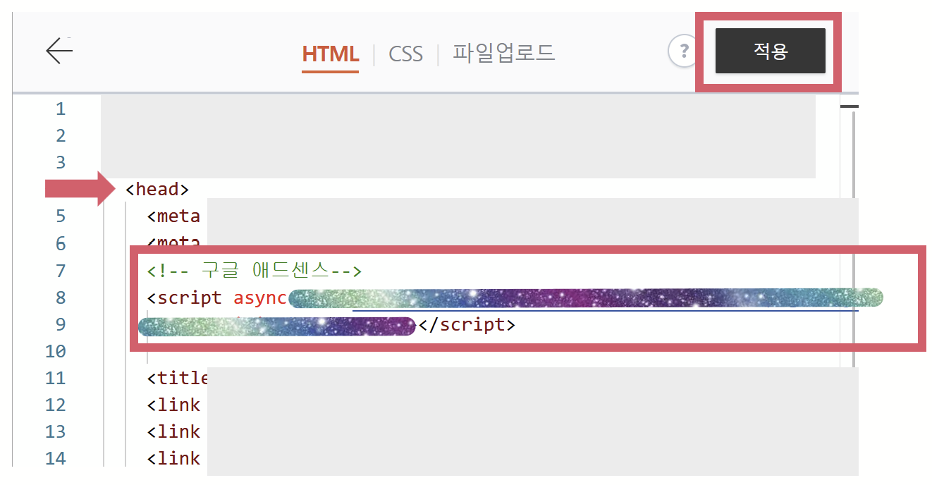 4) 들어가서 복사한 코드를 <head>와 </head> 태그 사이에 넣어주고 '적용' 버튼을 클릭하면 끝이다.