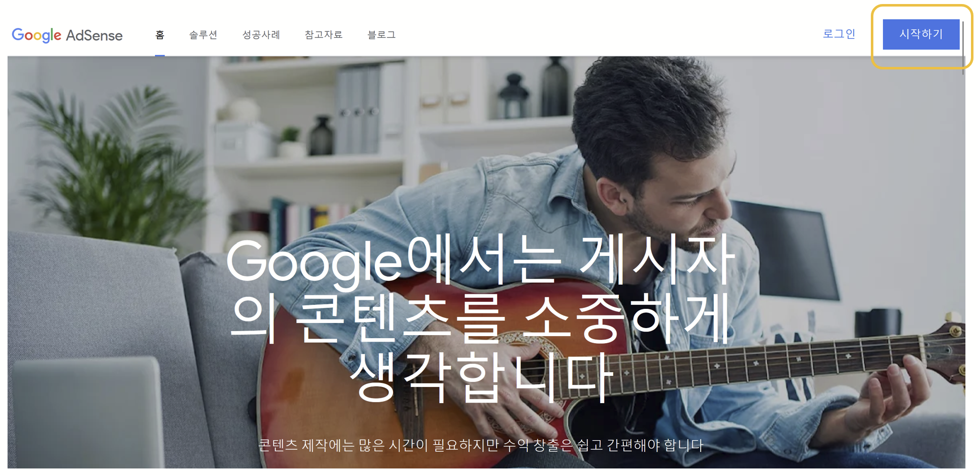 2). 애드센스 홈 메인화면에서 상단 우측의 시작하기 선택 후 가입하기 (기존 구글 계정으로 로그인하면 된다.)