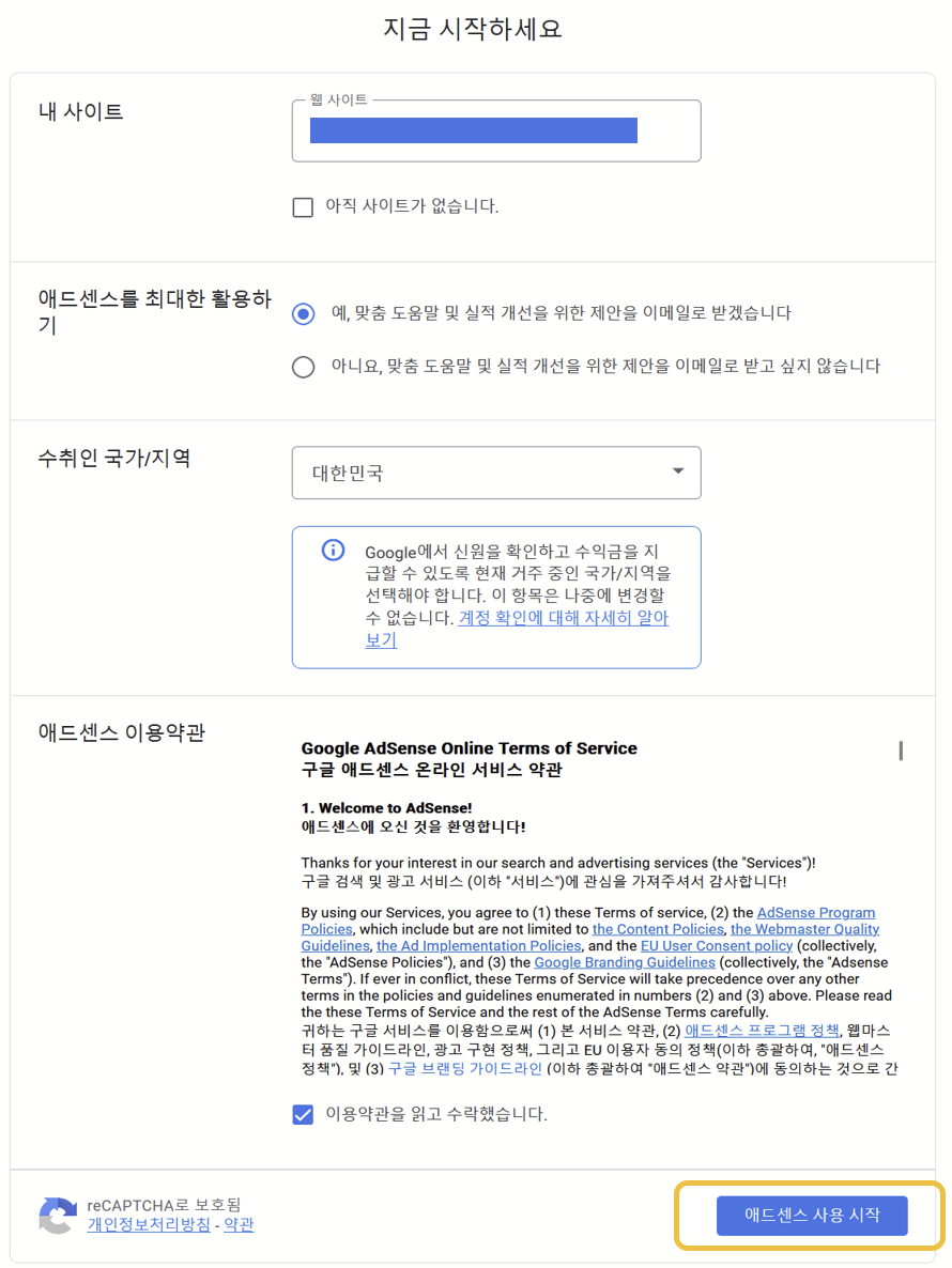 3). 광고를 게재할 사이트 도메인 입력 → 국가 선택 → 약관 동의 후 애드센스 사용 시작 버튼 클릭