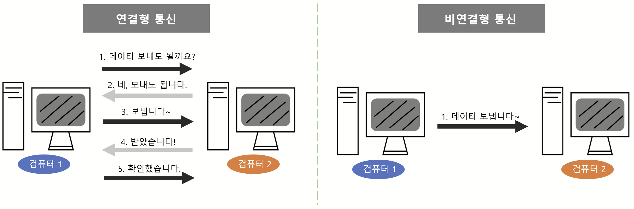 - 연결형 통신: 신뢰할 수 있고 정확하게 데이터를 전송하는 통신 방식