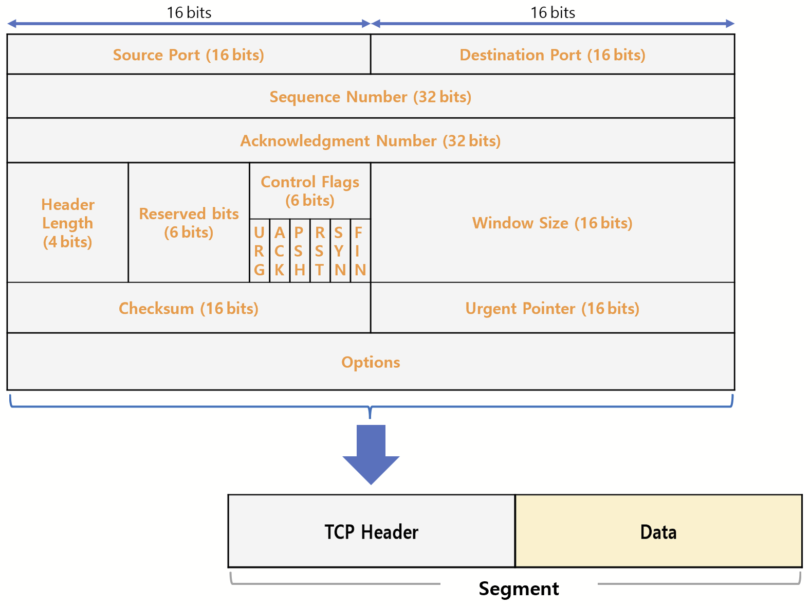 TCP 에 의해 붙여지는 헤더를 TCP 헤더라 하며, 이 TCP 헤더가 붙은 데이터를 세그먼트(Segment)라고 한다.