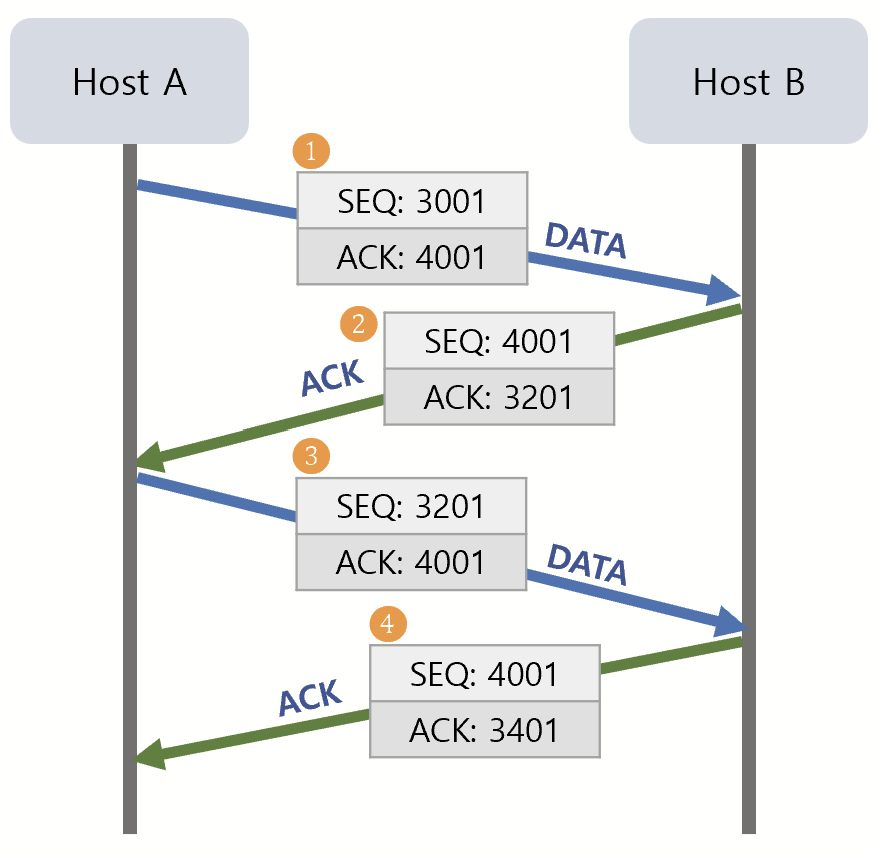 ❸ 호스트 A는 호스트 B에게 3201번부터 200 bytes의 데이터를 전송한다.