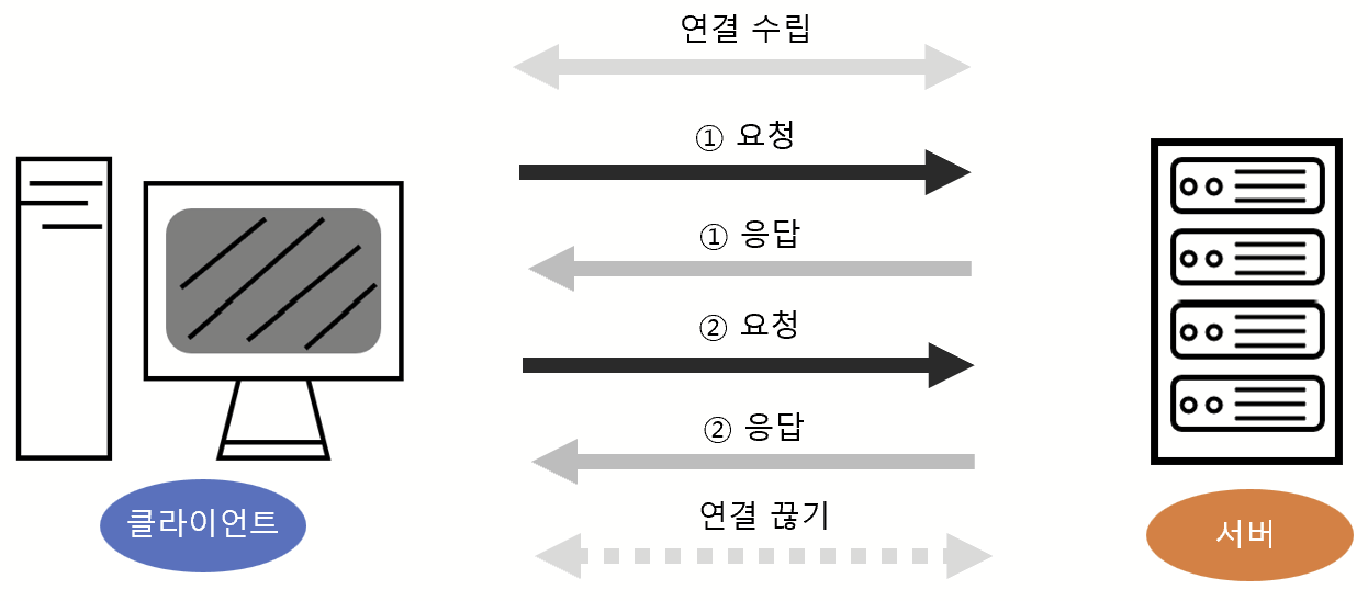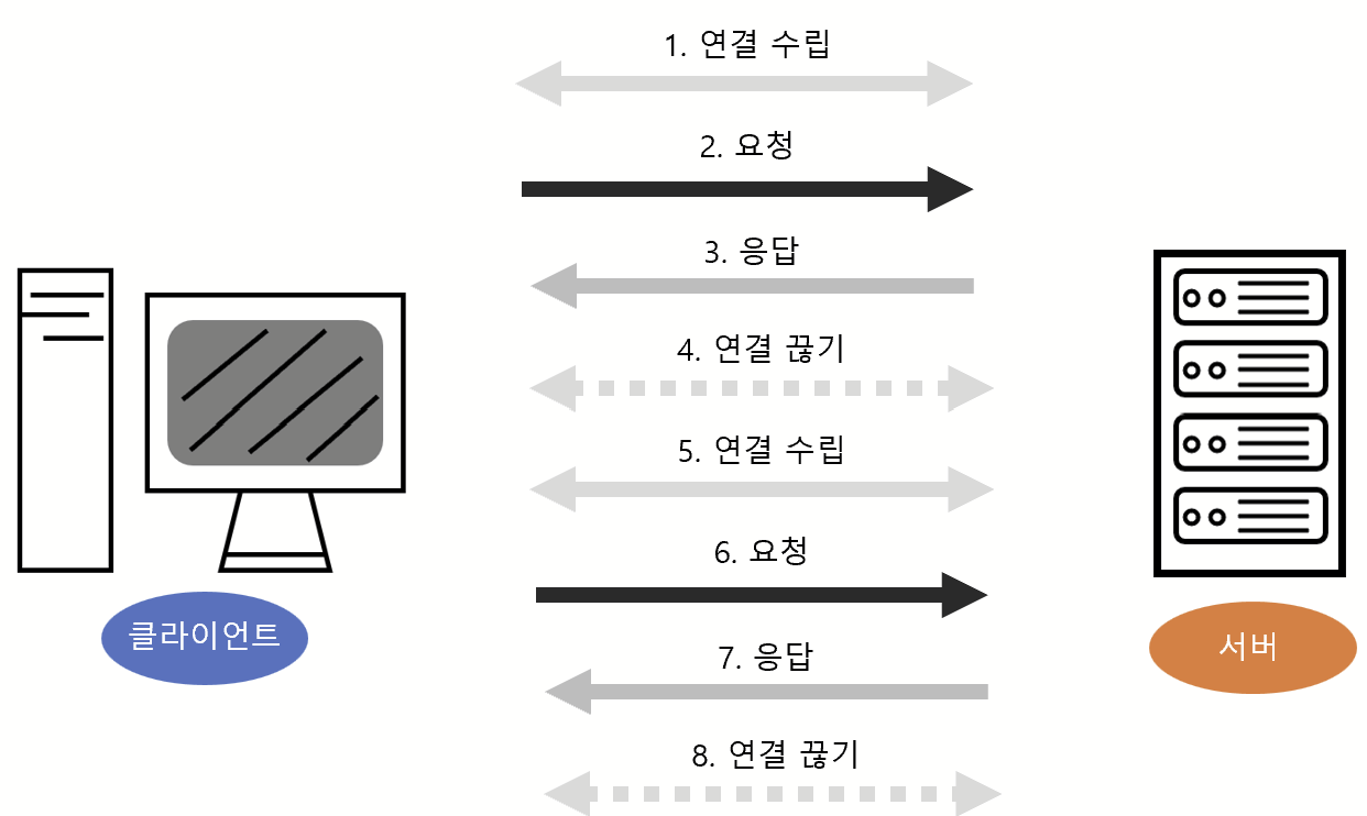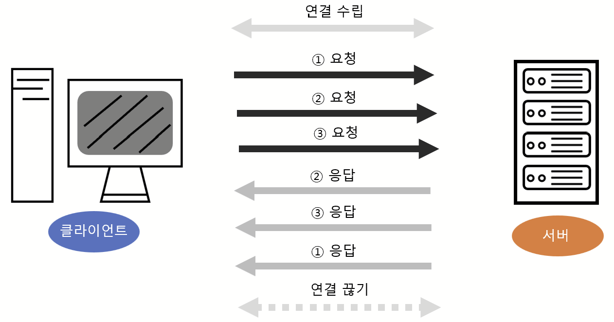 현재는 HTTP/2나 HTTP/1.1 버전을 사용하고 있지만 예전의 HTTP/1.0 버전에서는 위 그림과 같이 요청을 보낼 때마다 연결했다 끊는 작업을 반복했어야 했다.