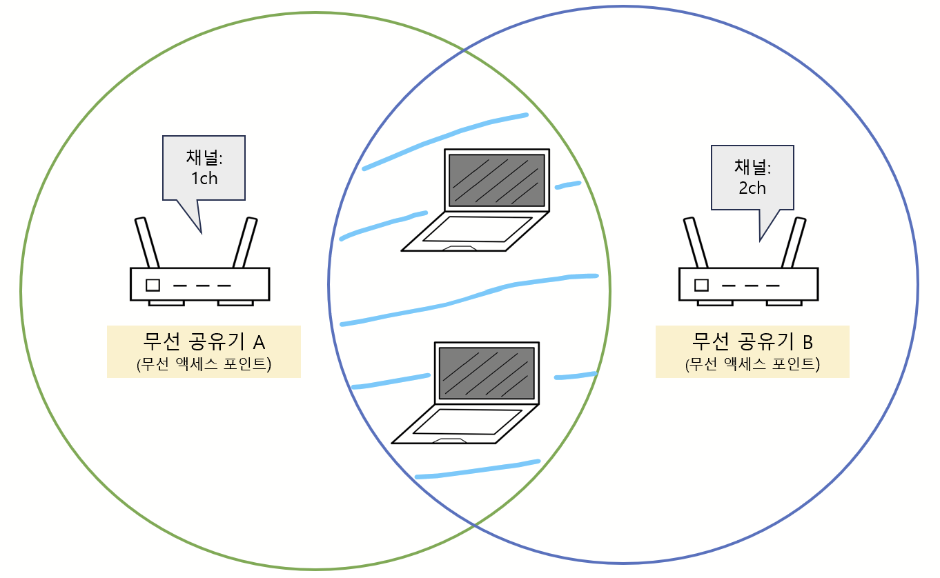 - 허나 무선 공유기 A와 무선 공유기 B는 다른 채널을 설정해야 한다.