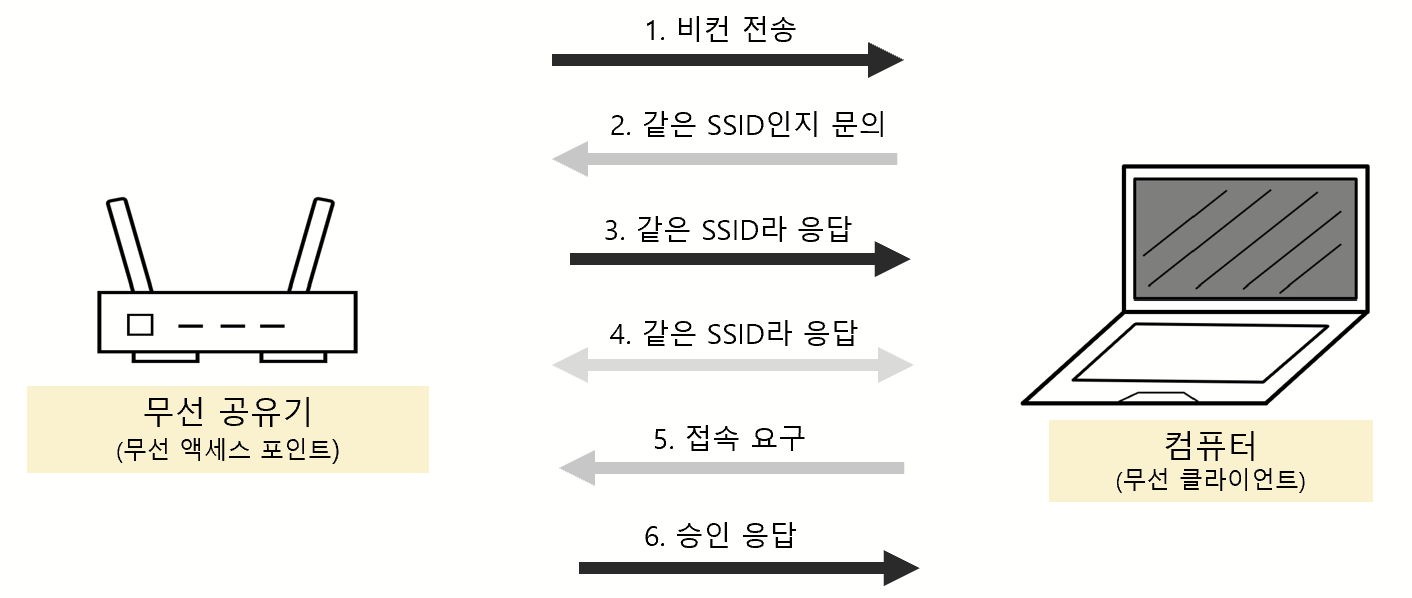 ② 이 신호를 받은 무선 클라이언트는 자신의 SSID와 같은지 무선 액세스 포인트에 문의한다.