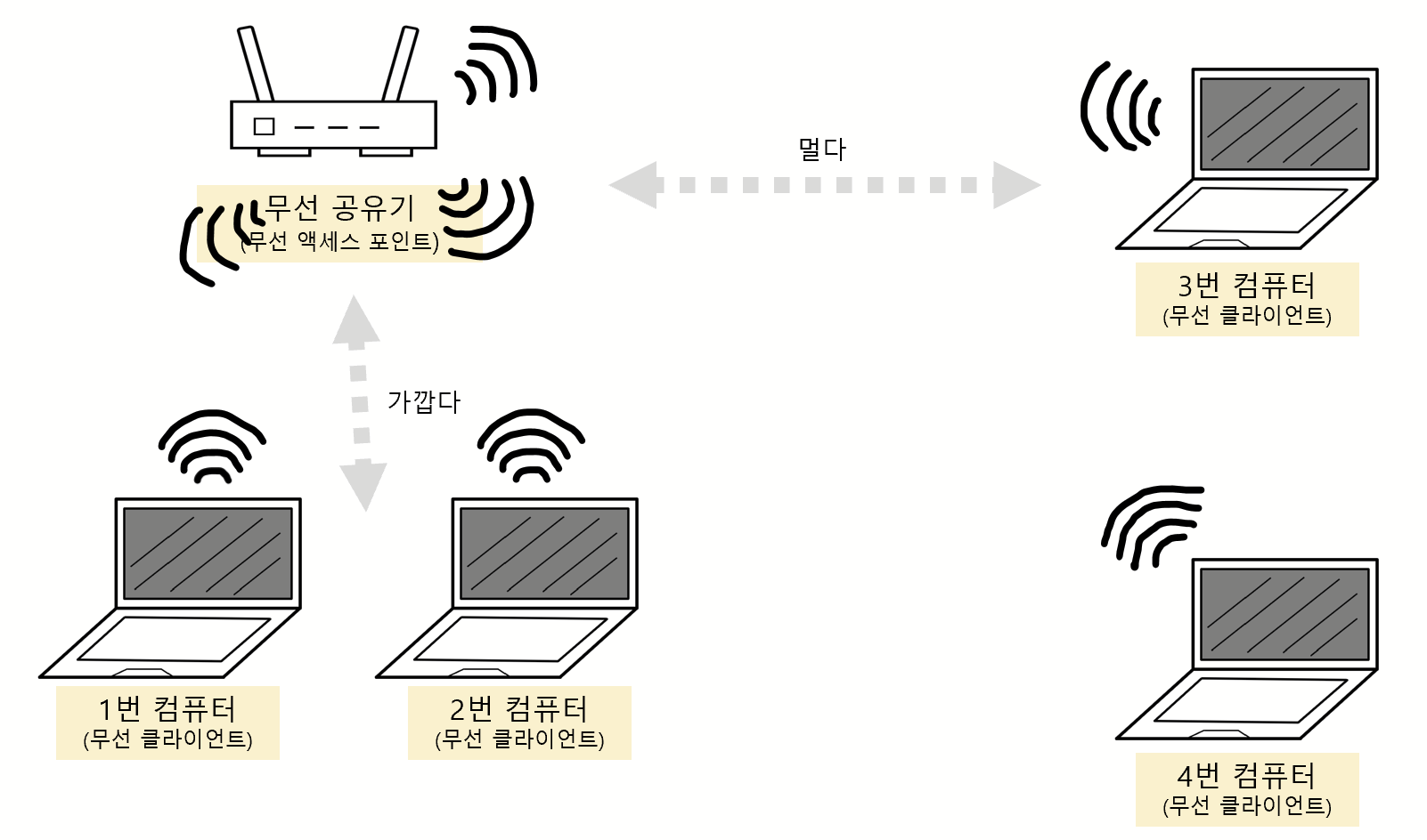 - 무선 액세스 포인트와 무선 클라이언트 사이의 거리가 멀수록 전파는 약해진다.
