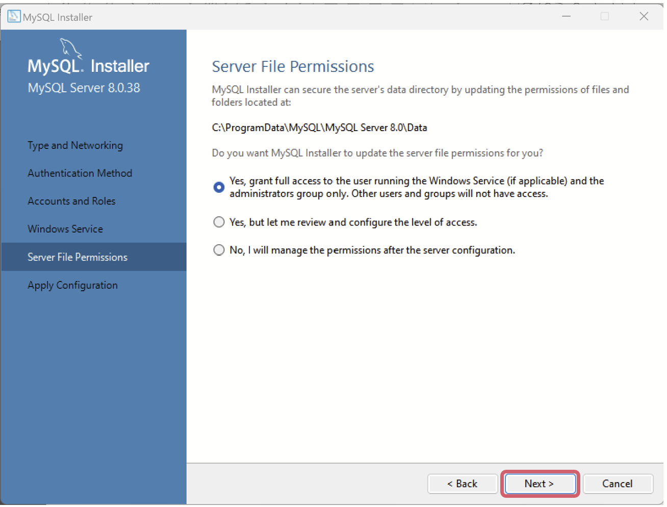 15. 서버 파일 권한에 대해 설정하는 항목으로 기본값인 첫번째 항목에 두고 Next 버튼을 클릭한다.