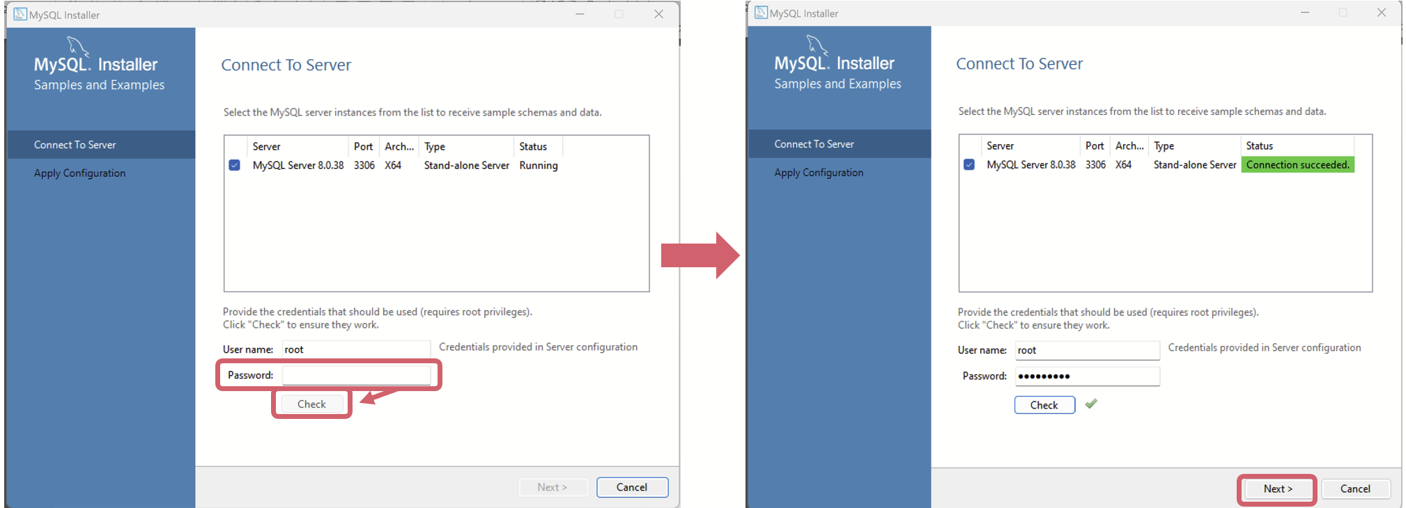 19. 아까 설정한 비밀번호를 입력 후 Check 버튼을 클릭하면, Connection succeeded 상태로 변경 된다. 변경이 완료되었으니 Next 버튼을 클릭한다.