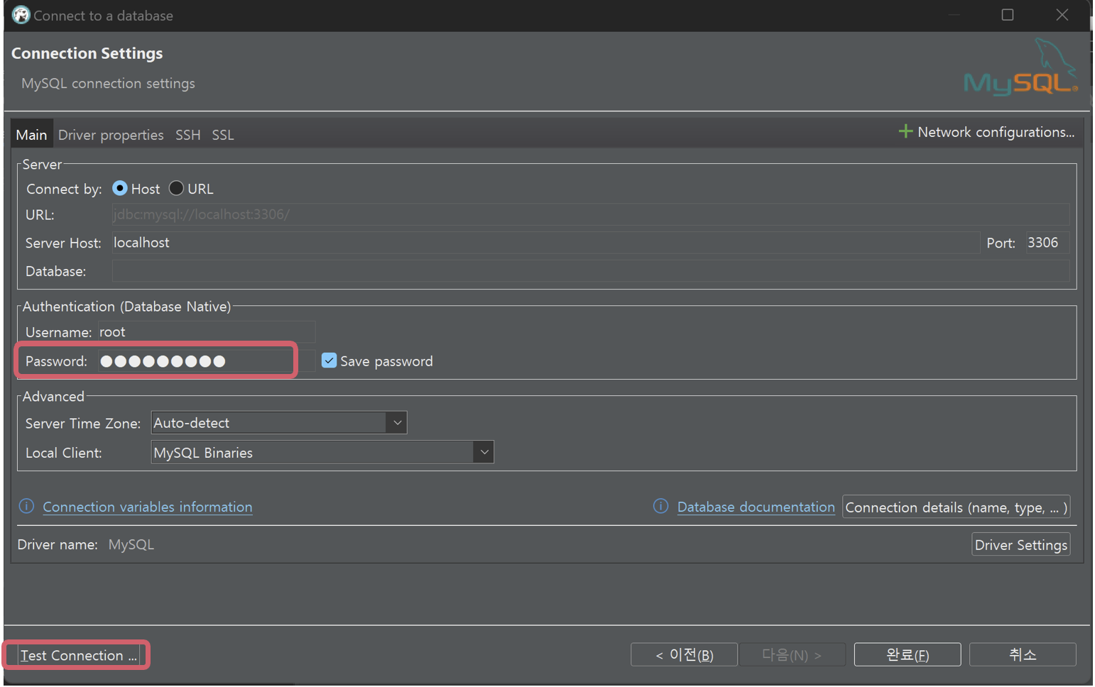 3. MySQL을 설치했을 때 설정한 비번을 입력해주고 Test Connection 버튼을 클릭한다.