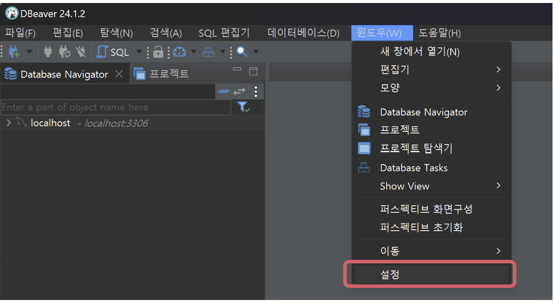 5. 윈도우 탭에서 설정을 클릭해준다.