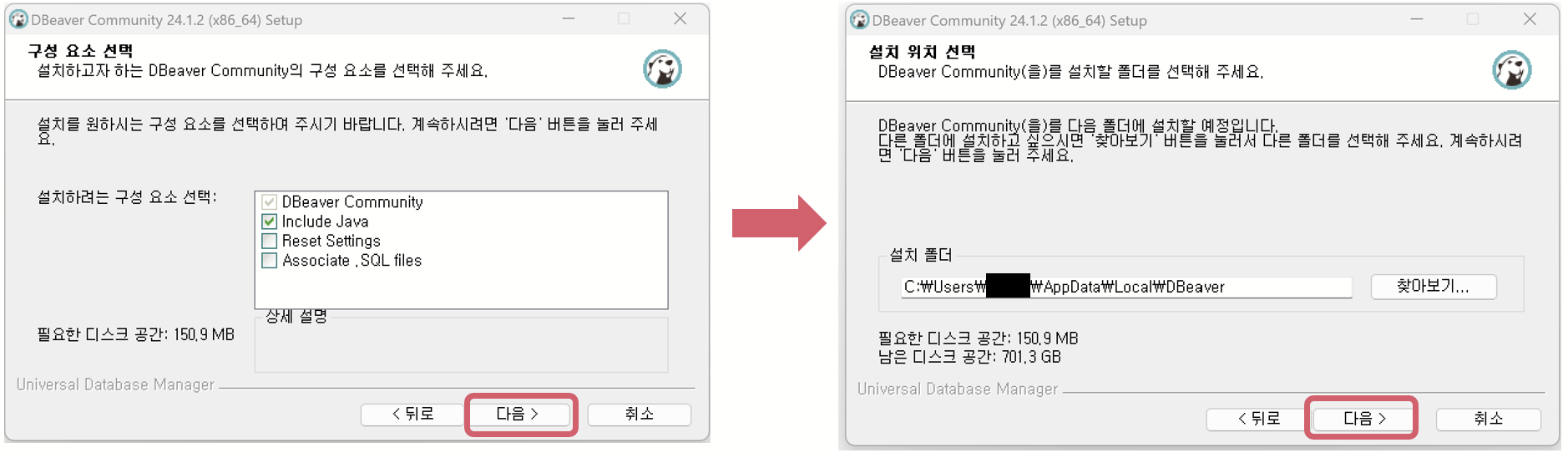 6. 구성 요소 선택에서 기본값으로 두고 다음 버튼을 누른 후, 설치할 경로 선택 후 다시 다음 버튼을 클릭한다.