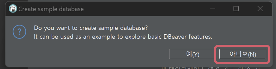 1. 다운받은 디비버 앱을 클릭하고 당장 데이터베이스를 만들 게 아니니 아니오를 클릭한다.