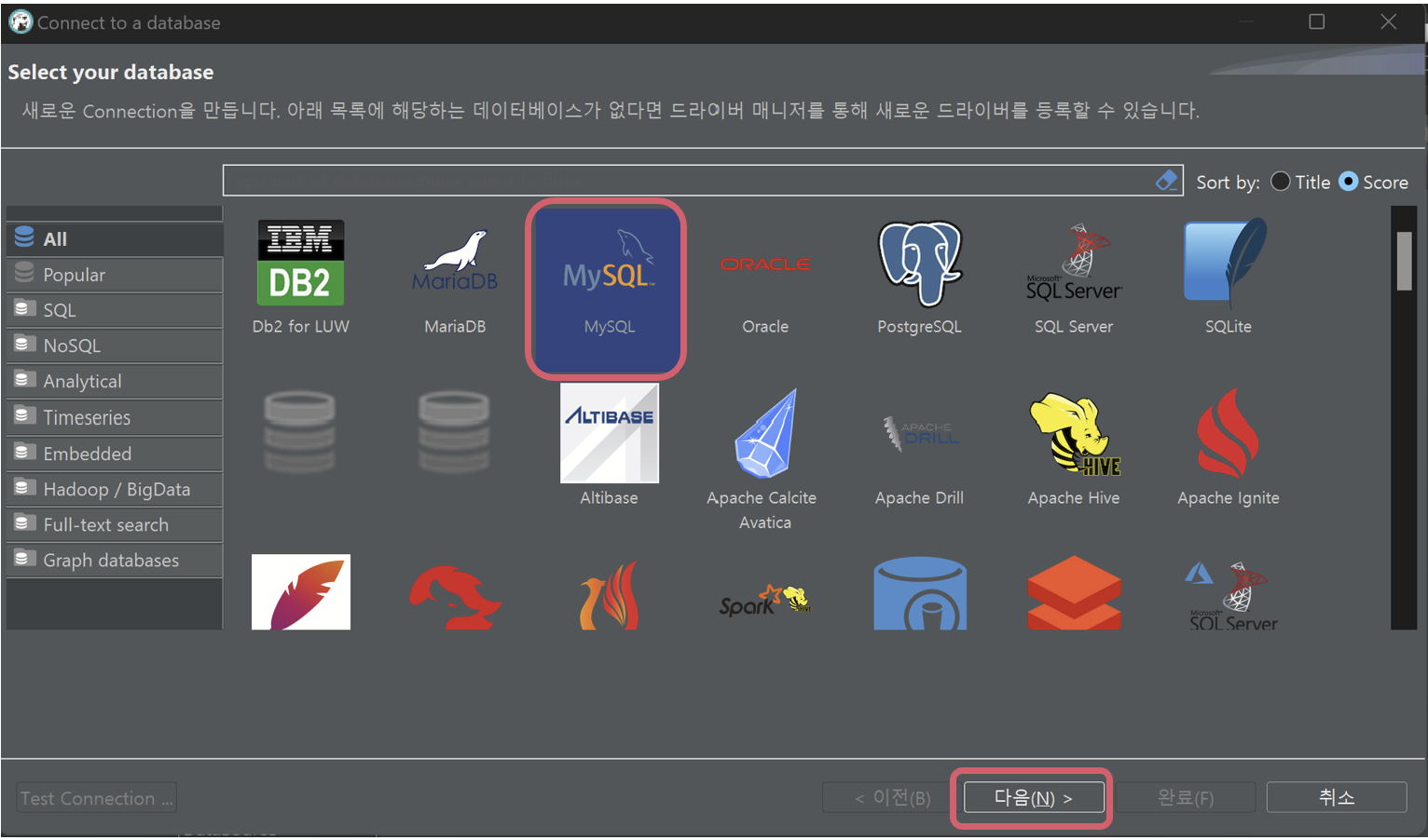 2. 원하는 RDBMS을 선택해주고 다음 버튼을 클릭한다.