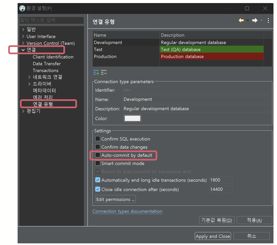 6. 연결 항목 → 연결 유형으로 들어가 자동 커밋을 꺼준다. (자동 커밋을 추천하지 않는다고 한다.)