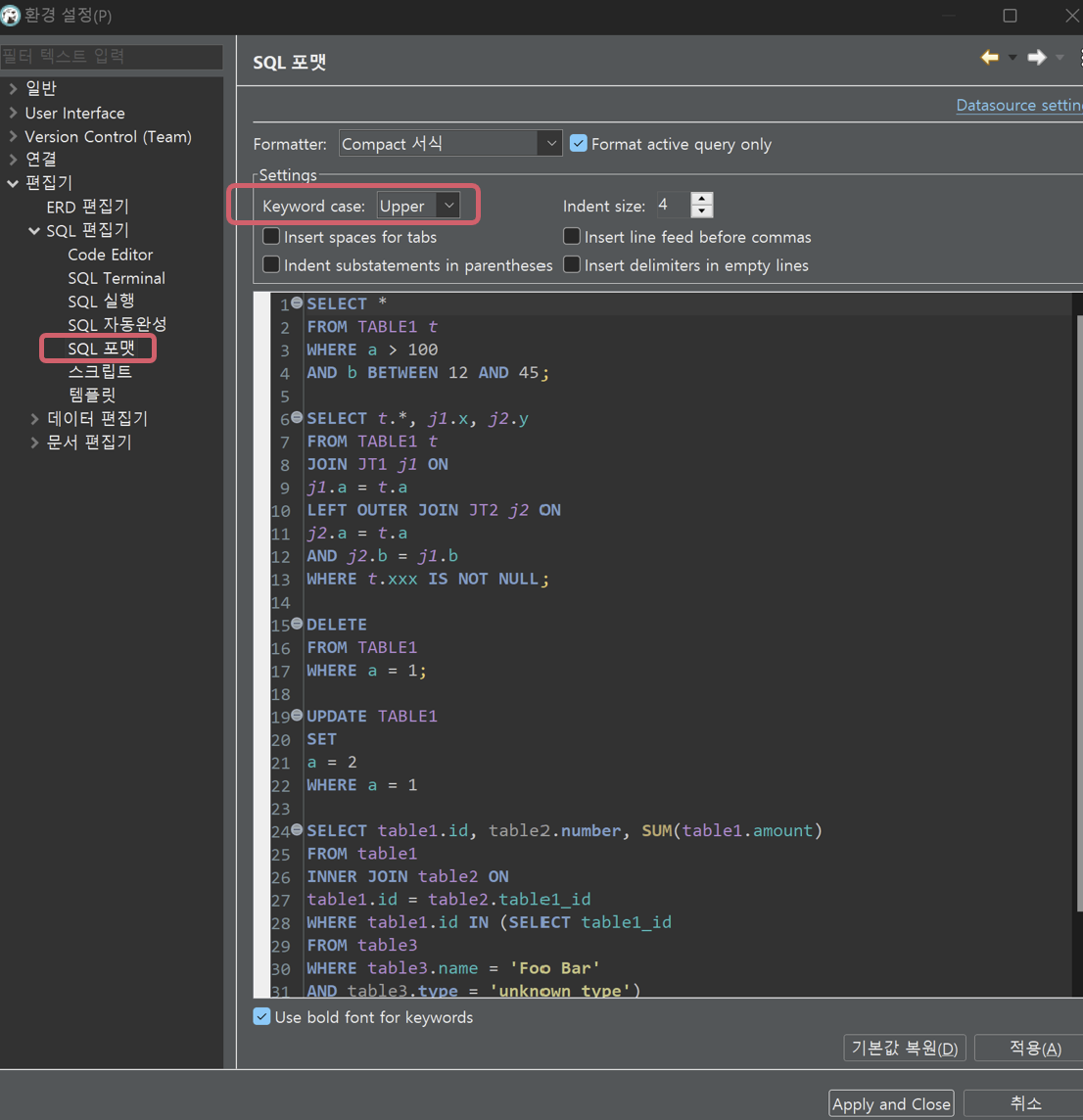 마지막으로 [SQL 포맷]에서 Keyword Case를 Upper Case로 선택 후 적용을 눌러주고Apply and Close 까지 클릭해주면 끝이다.