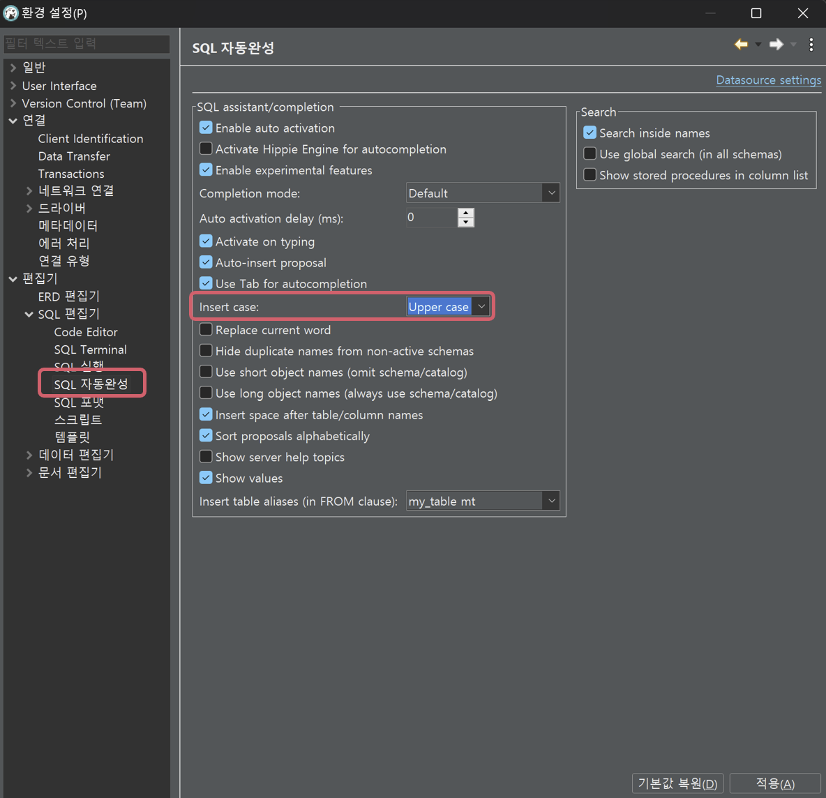 목록 중 편집기 → SQL 편집기에서 [SQL 자동완성]을 클릭해 Insert Case를 Upper Case로 선택 후 적용을 눌러준다.