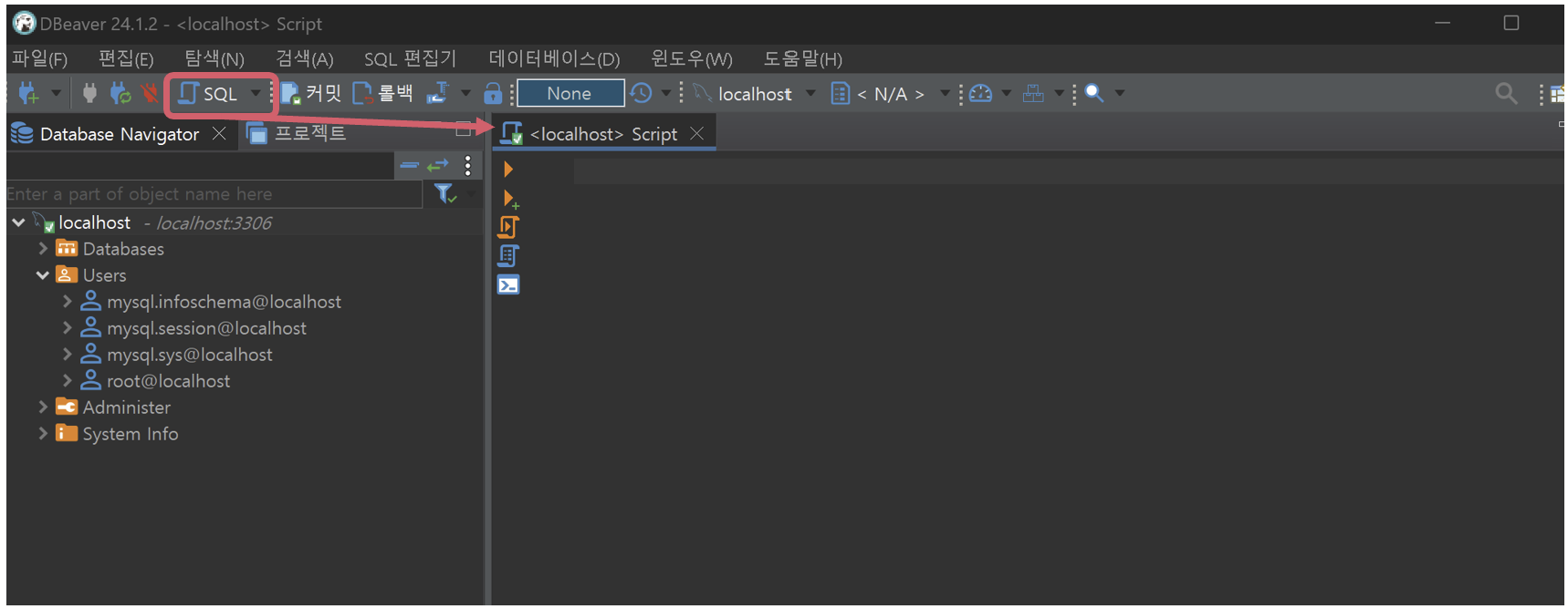 7. SQL 버튼을 클릭해 새 스크립트를 꺼내준다.