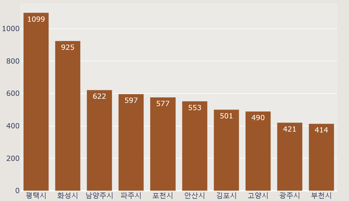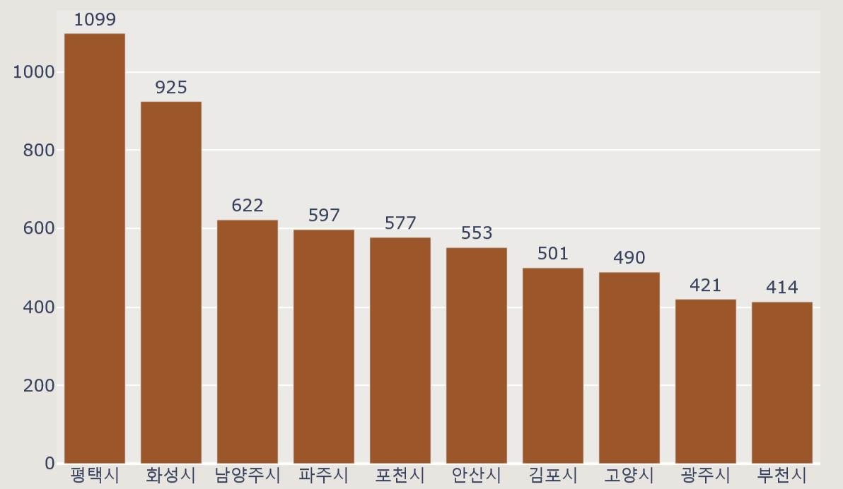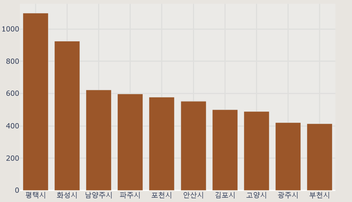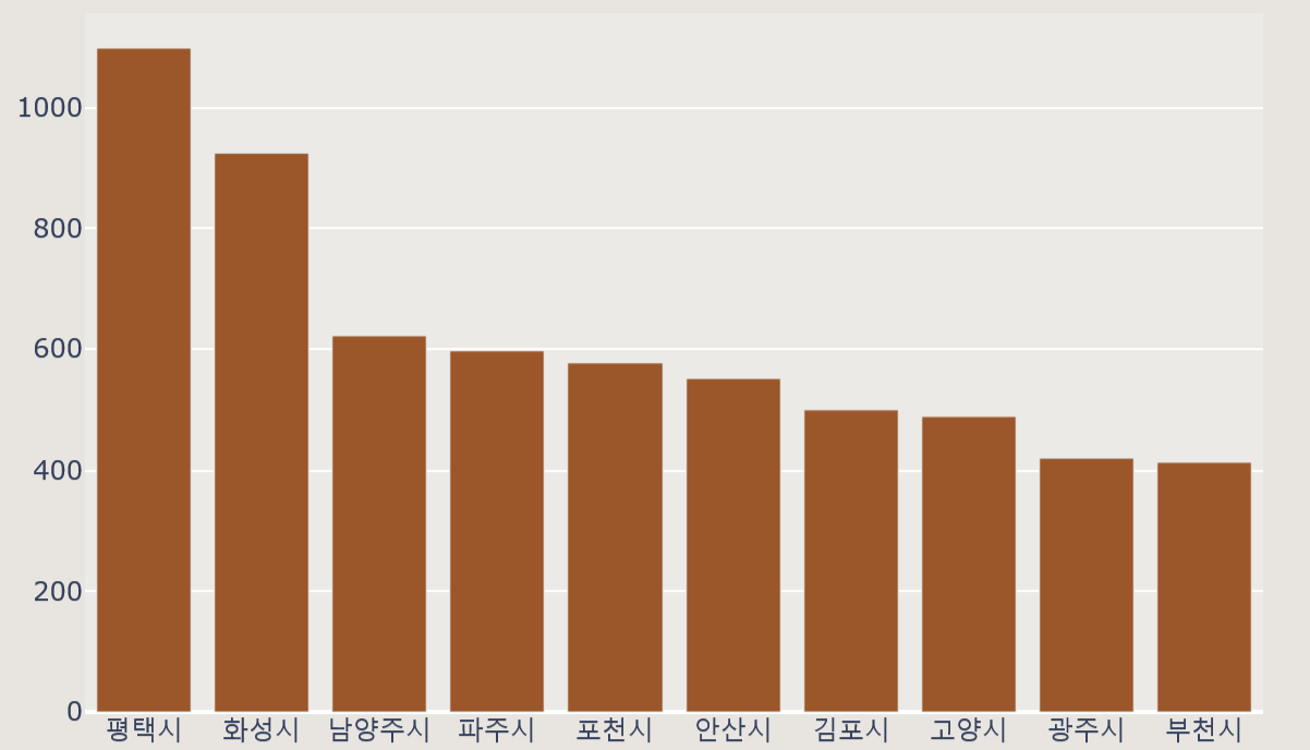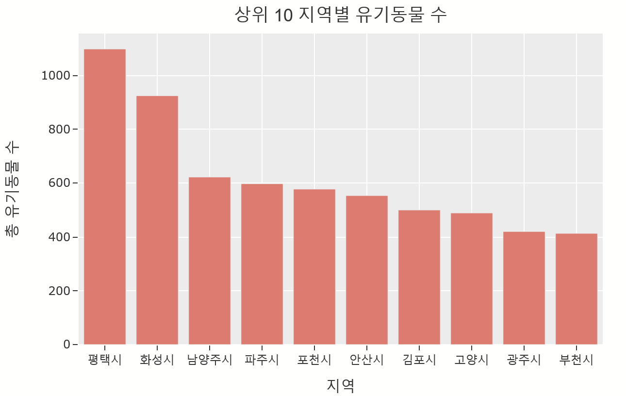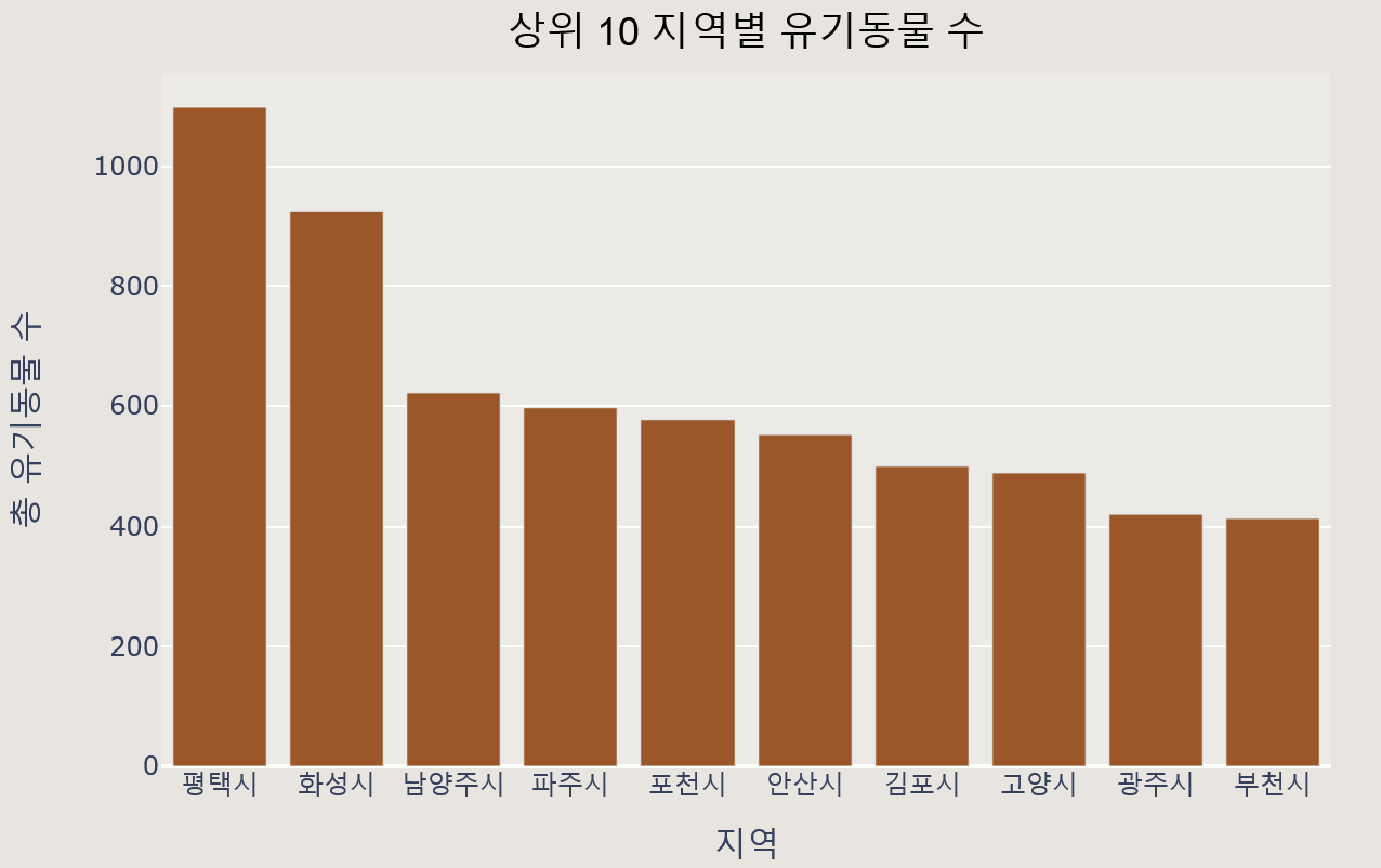 region_top10 = data.groupby('시군명').size().reset_index(name = '유기동물 수').sort_values(by = '유기동물 수', ascending = False).head(10)