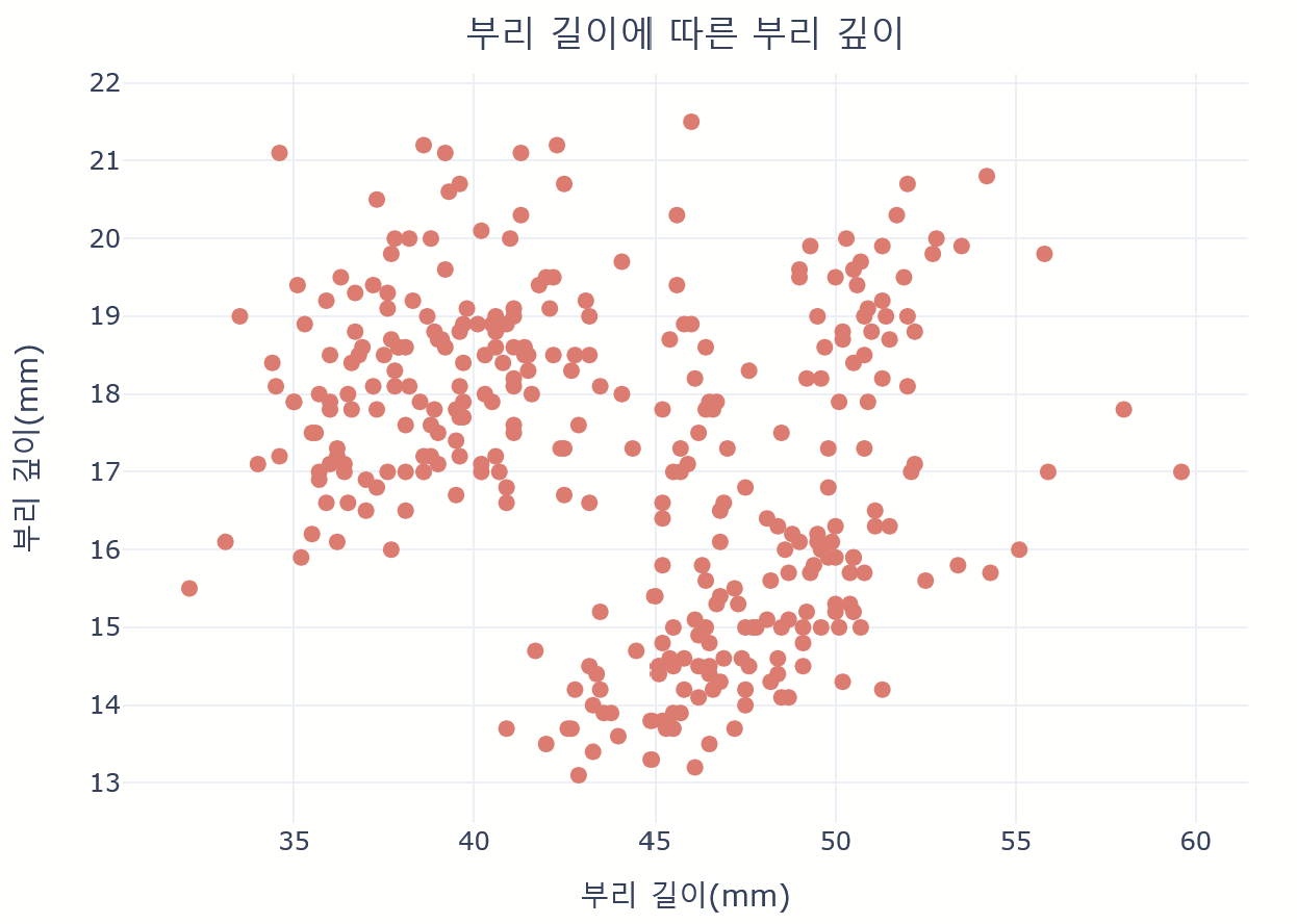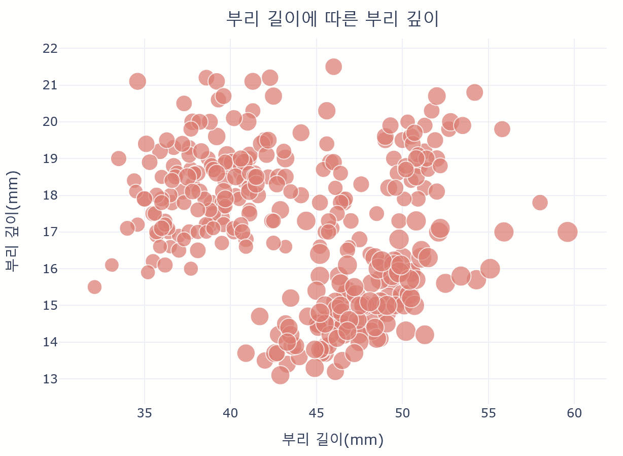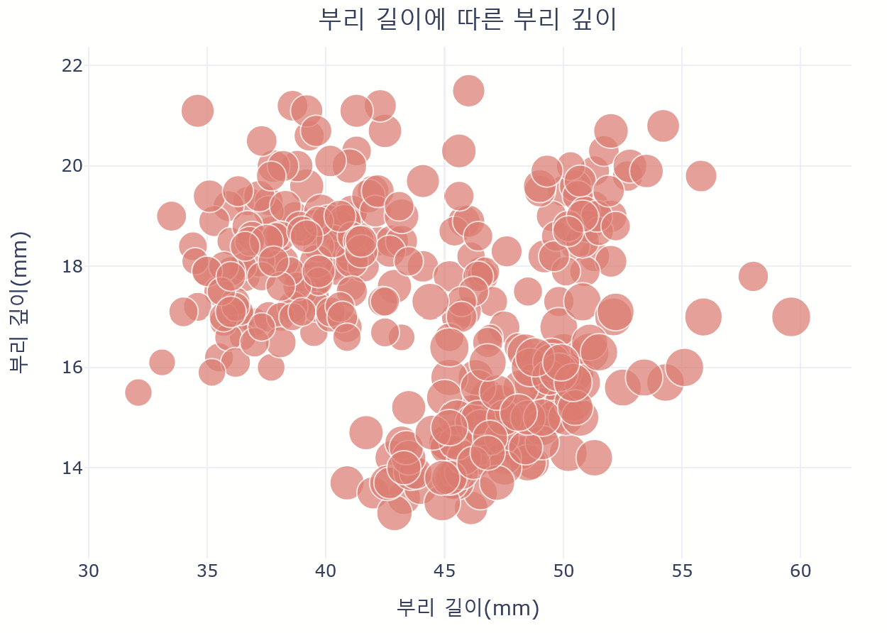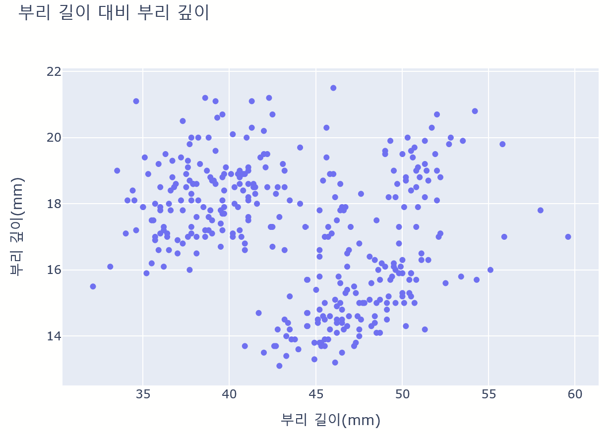 labels={'bill_length_mm': '부리 길이(mm)', 'bill_depth_mm': '부리 깊이(mm)'}, width=700, height=500)