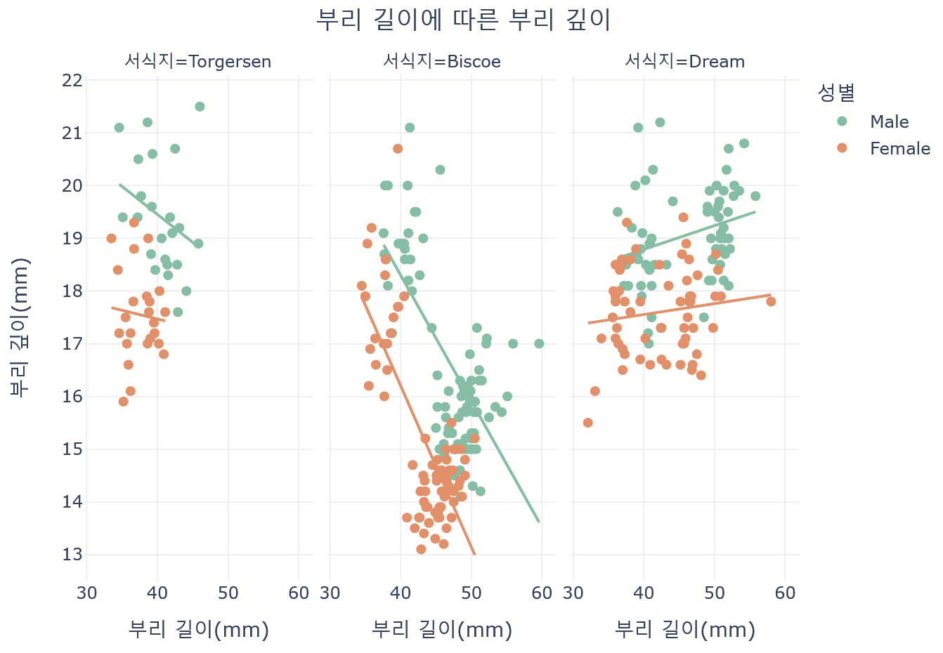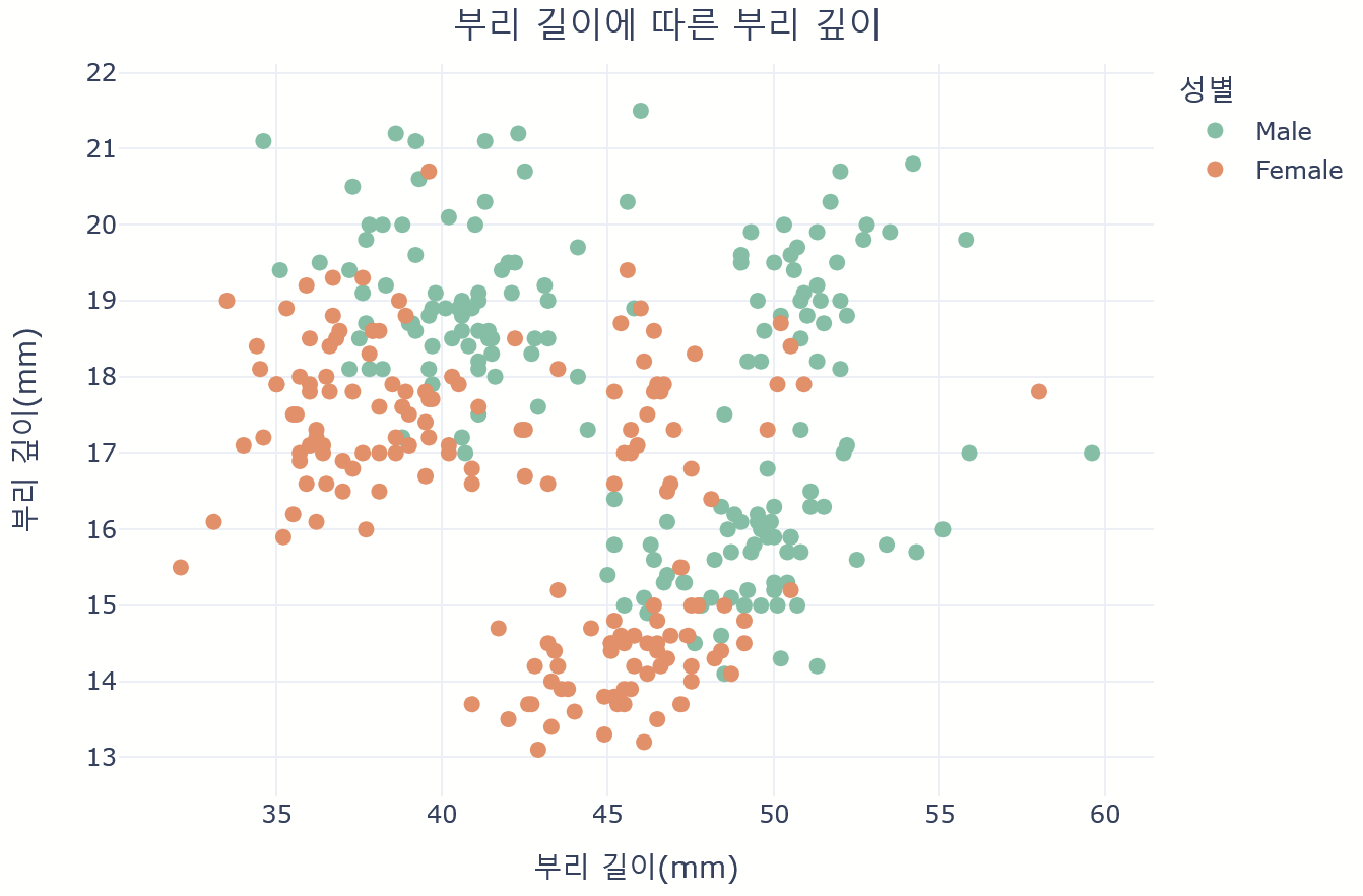 labels={'bill_length_mm': '부리 길이(mm)', 'bill_depth_mm': '부리 깊이(mm)','sex':'성별'},