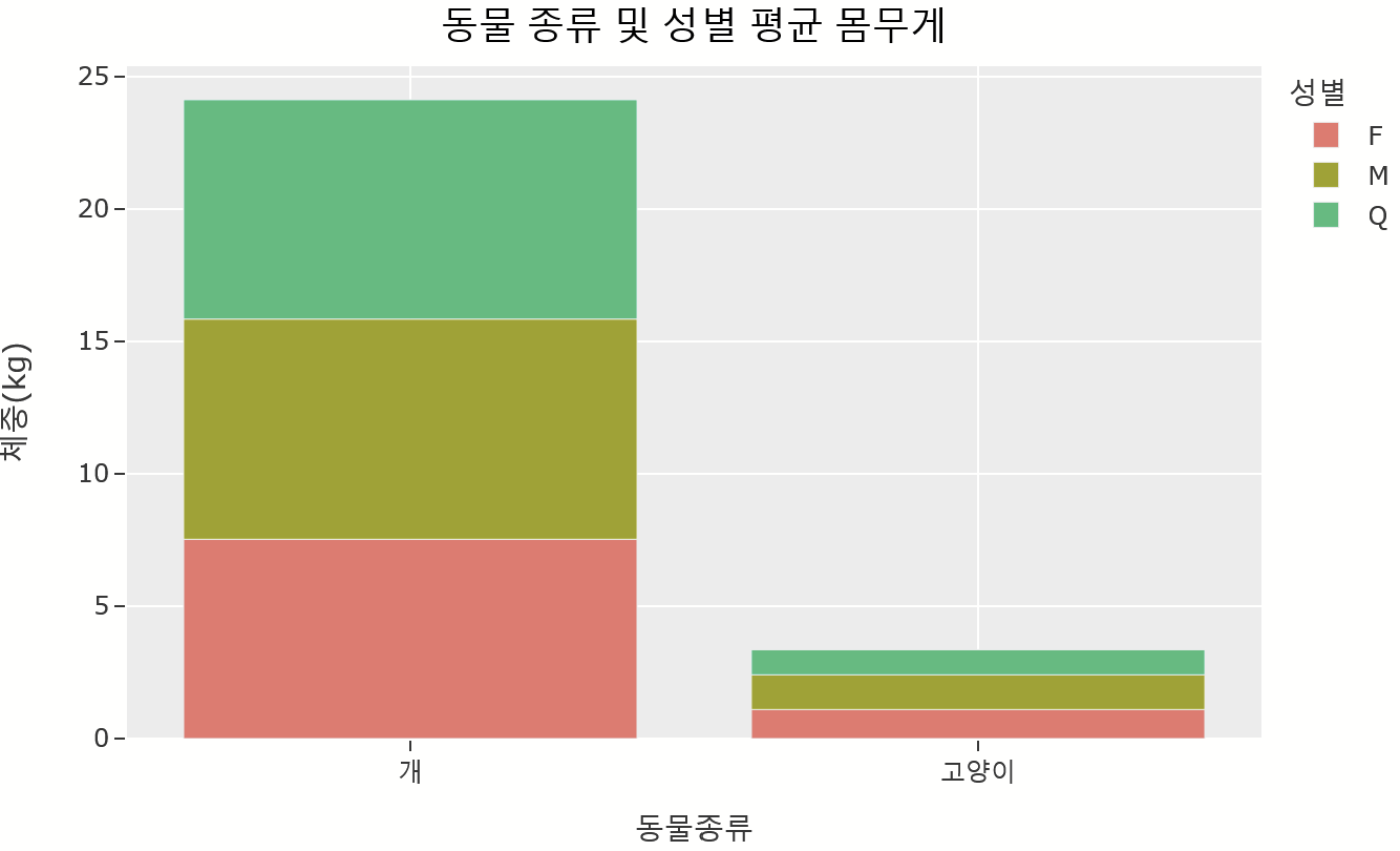 labels={'동물종류': '동물 종류', '체중(kg)': '평균 체중(kg)', '성별': '동물 성별'})