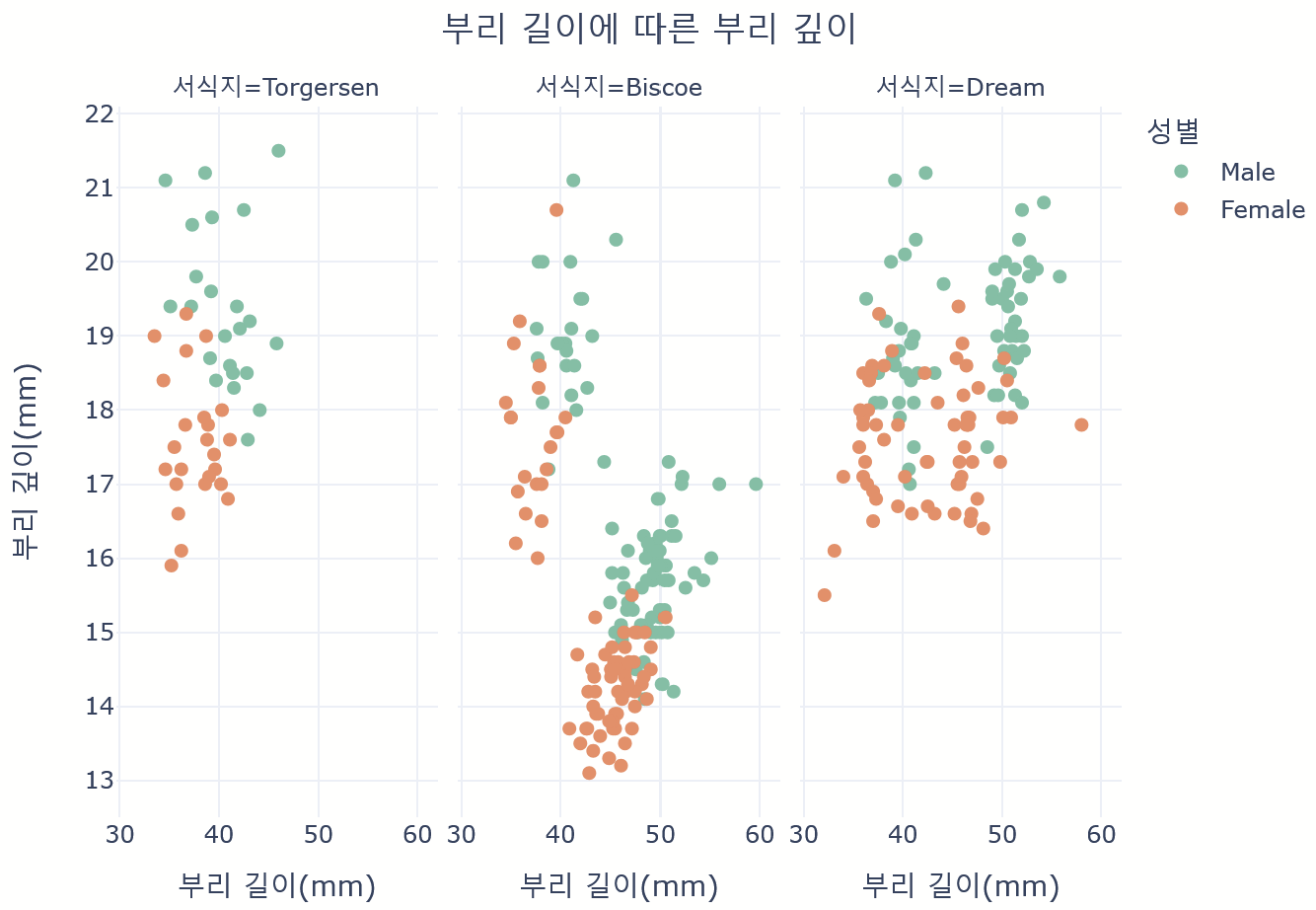 labels={'bill_length_mm': '부리 길이(mm)', 'bill_depth_mm': '부리 깊이(mm)','sex':'성별', 'island' : '서식지'},