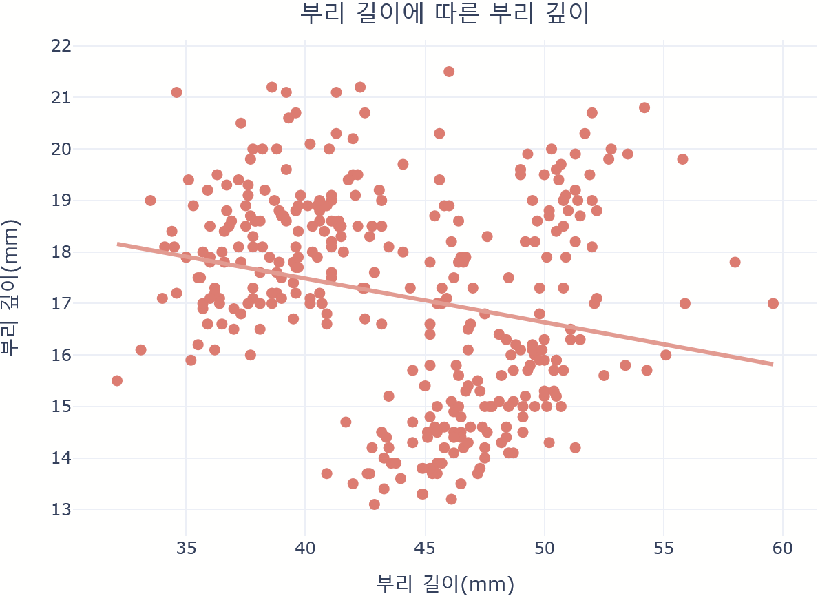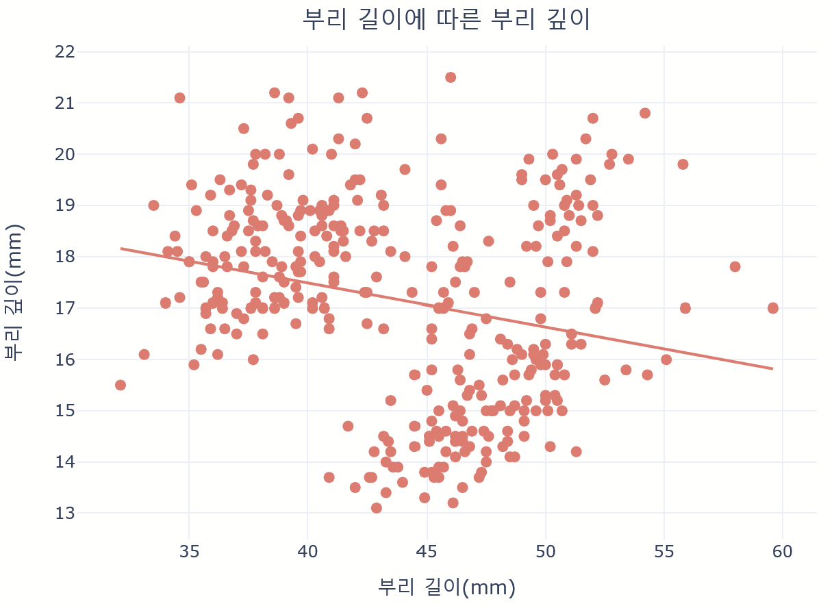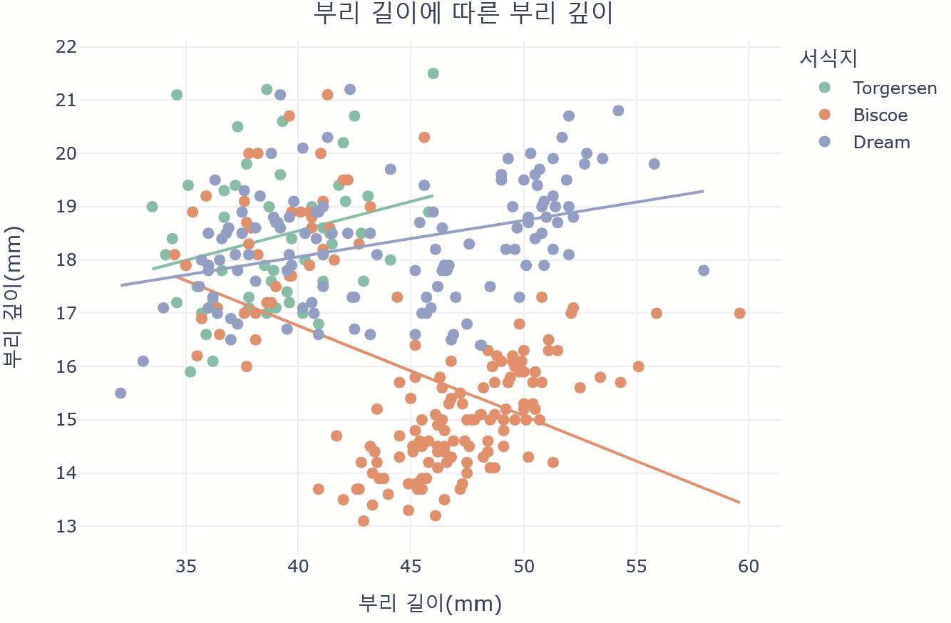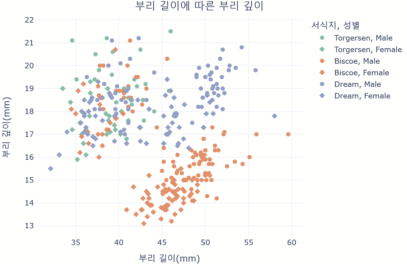 labels={'bill_length_mm': '부리 길이(mm)', 'bill_depth_mm': '부리 깊이(mm)'},