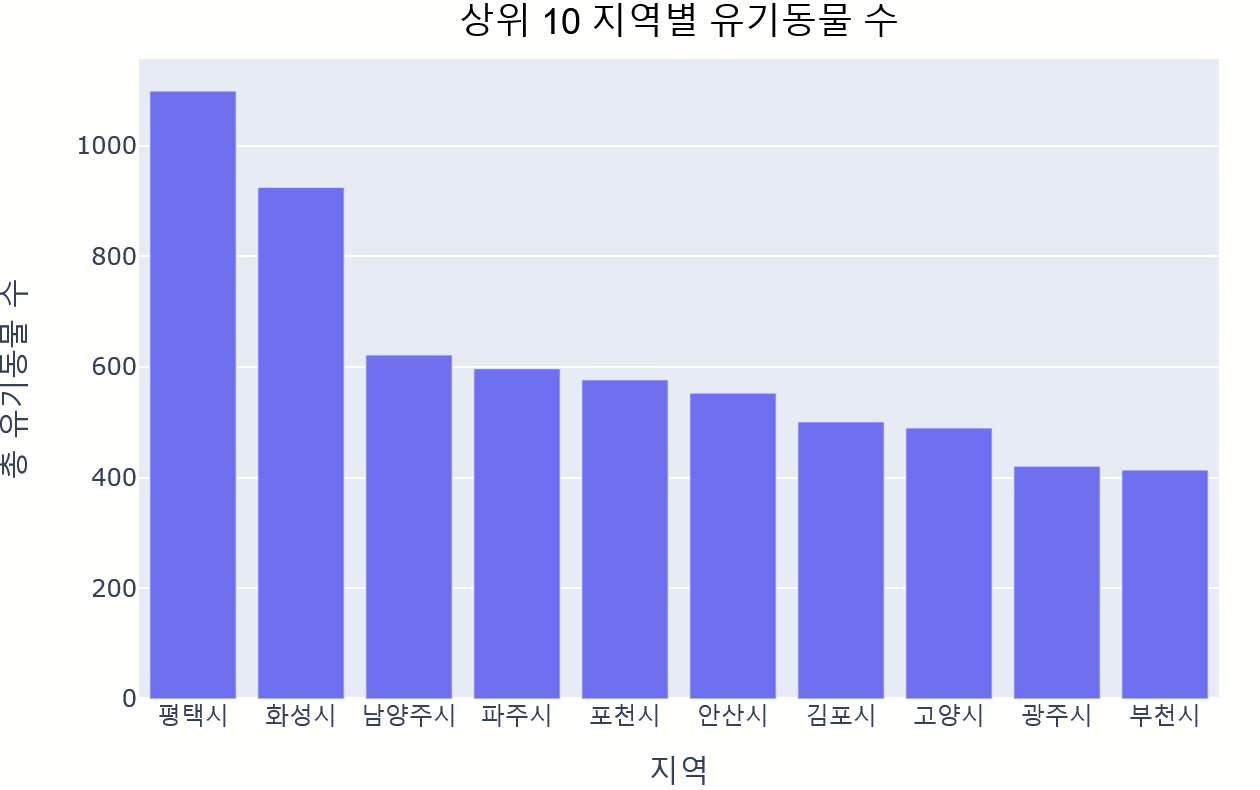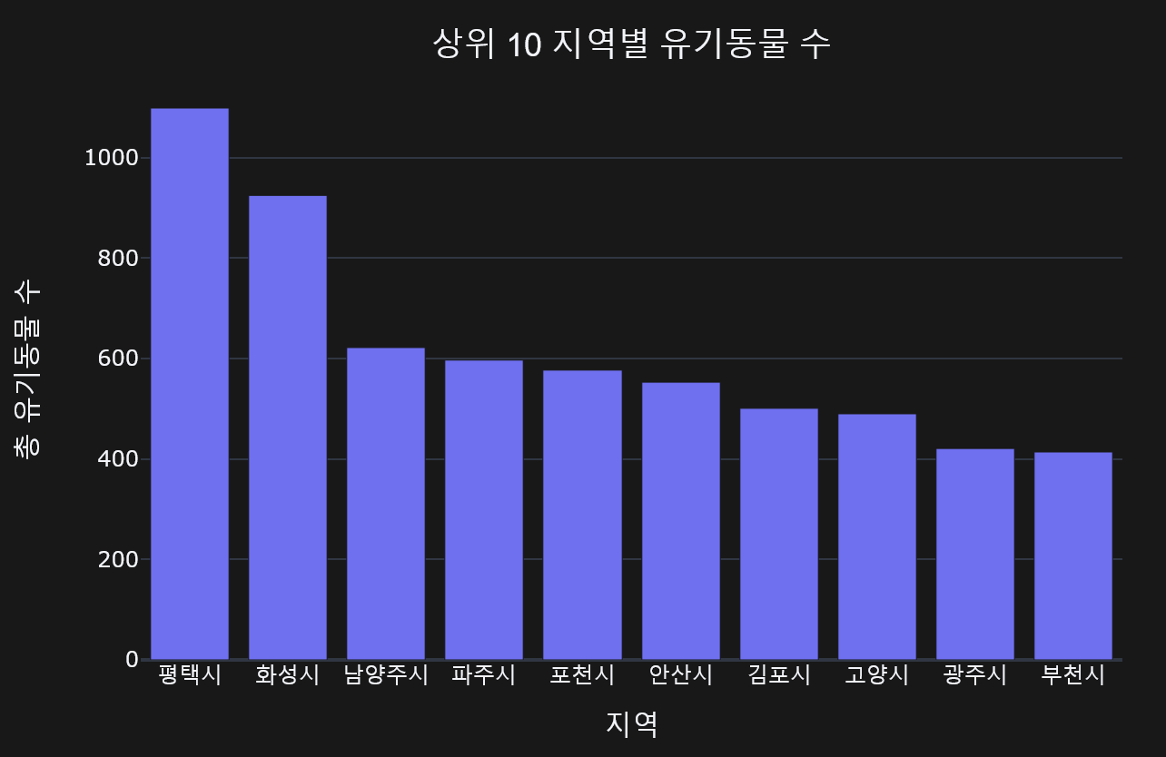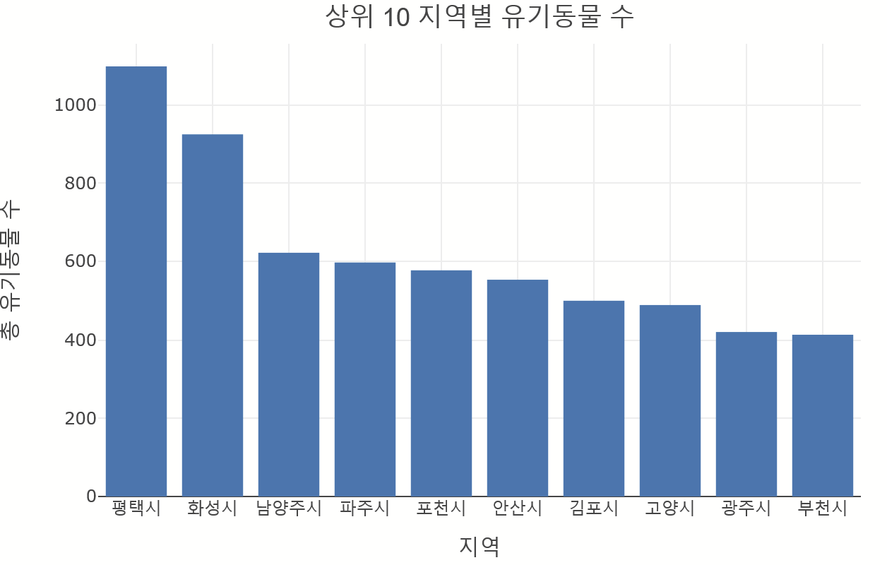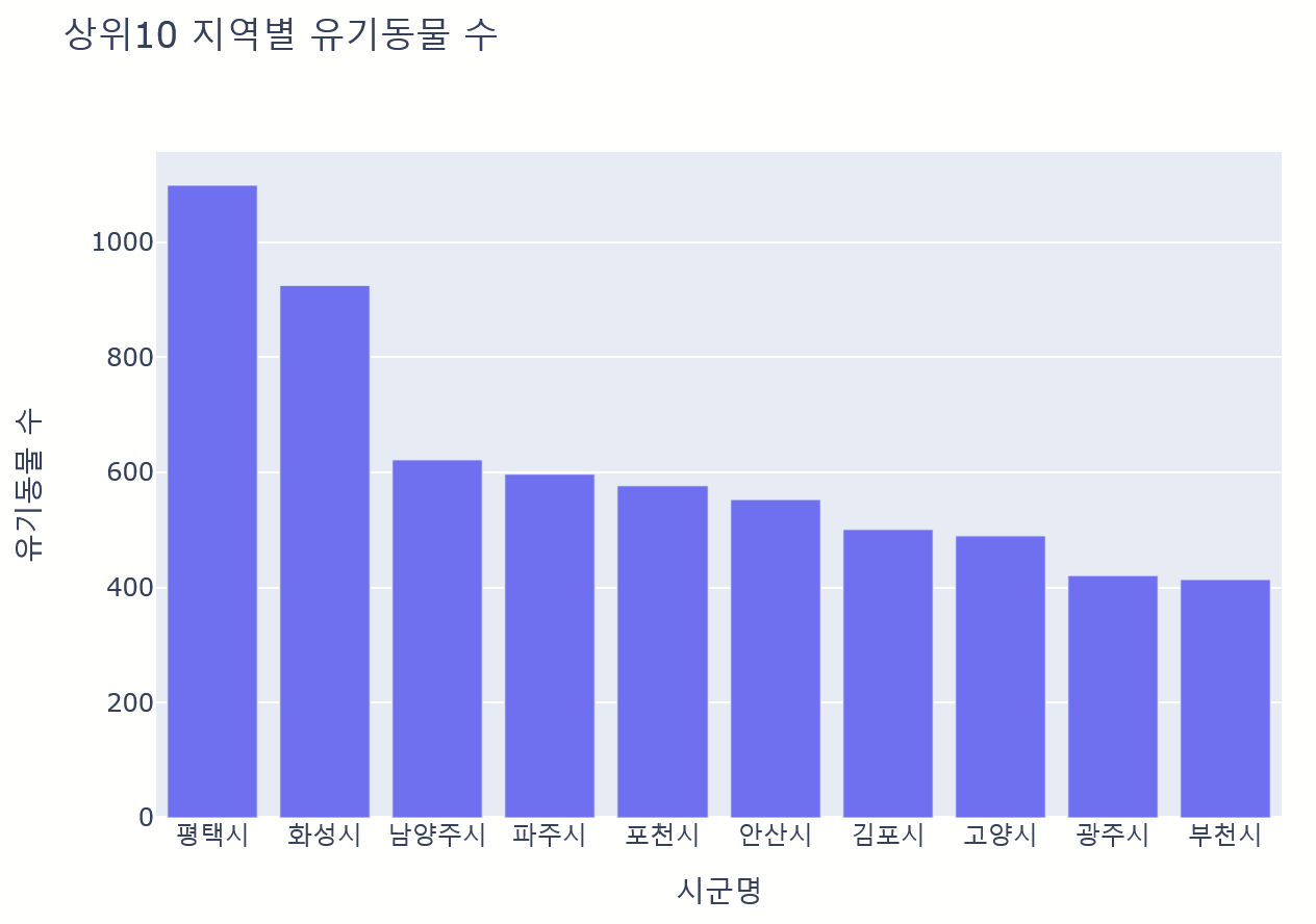 title = '상위10 지역별 유기동물 수', width=700, height=500, template = '템플릿명')
