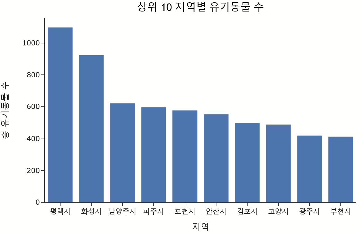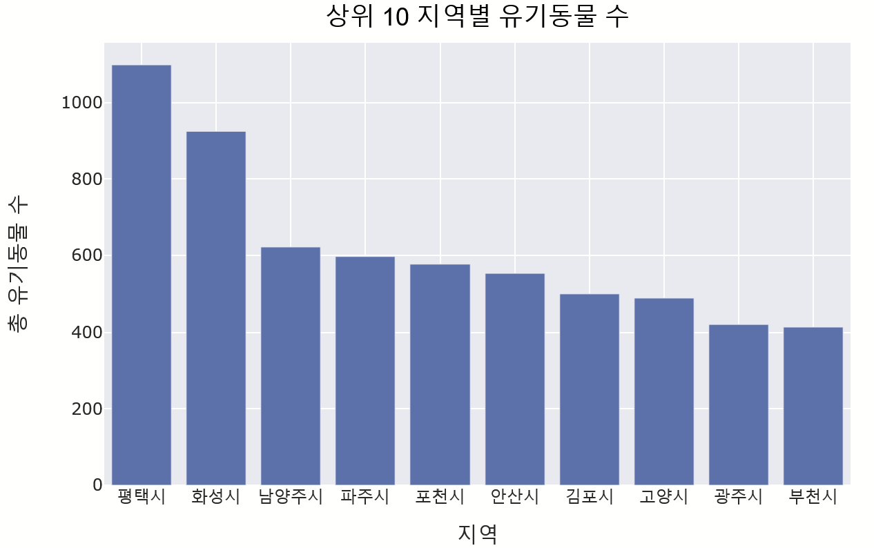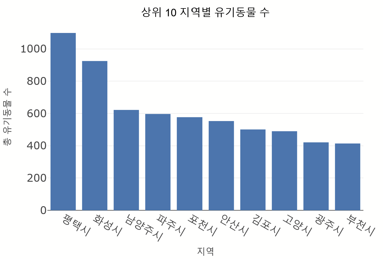 title = '상위10 지역별 유기동물 수', width=700, height=500, template = '템플릿명')