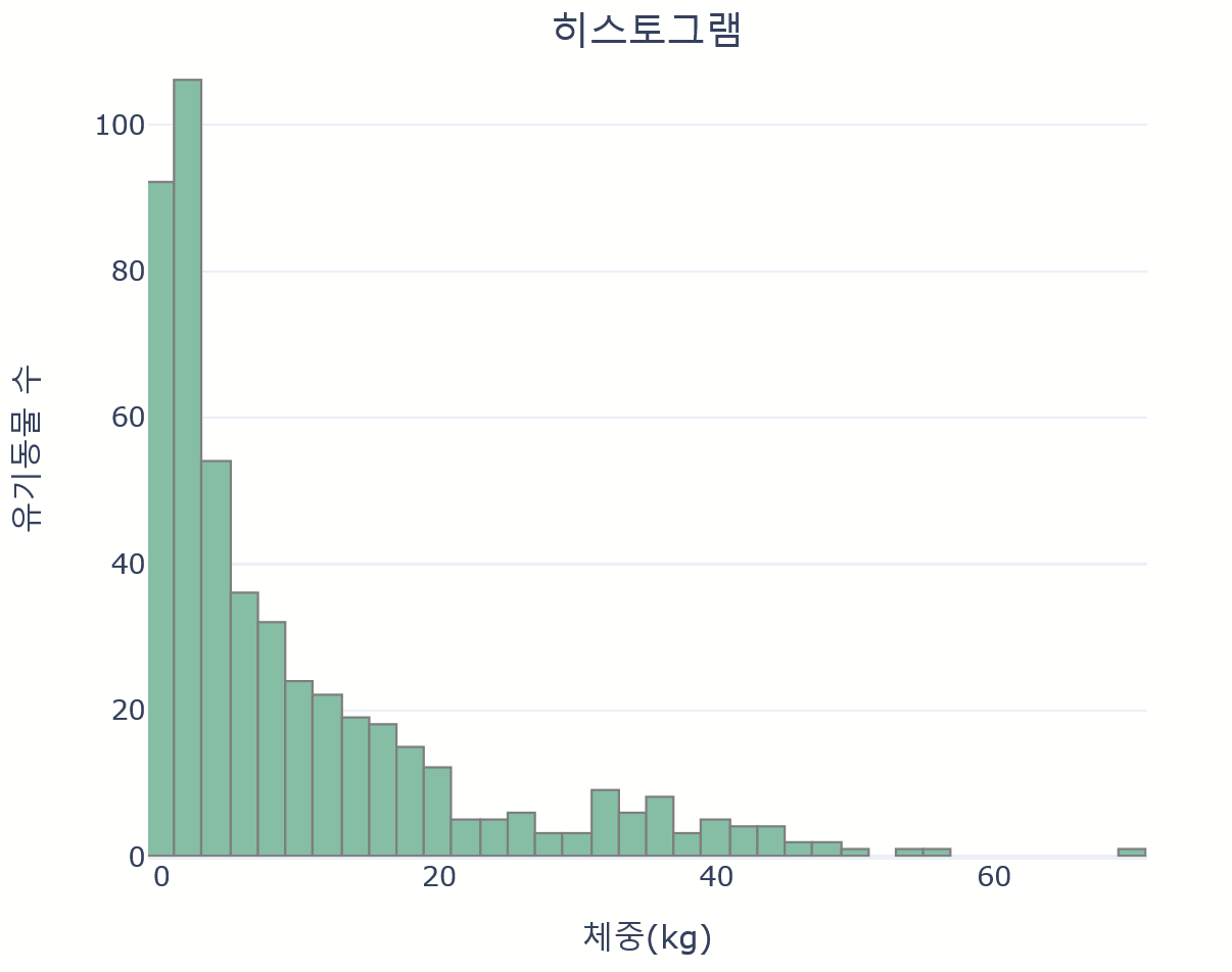 fig = px.histogram(data_frame=animals_weight, x='체중(kg)', color_discrete_sequence=px.colors.qualitative.Set2,