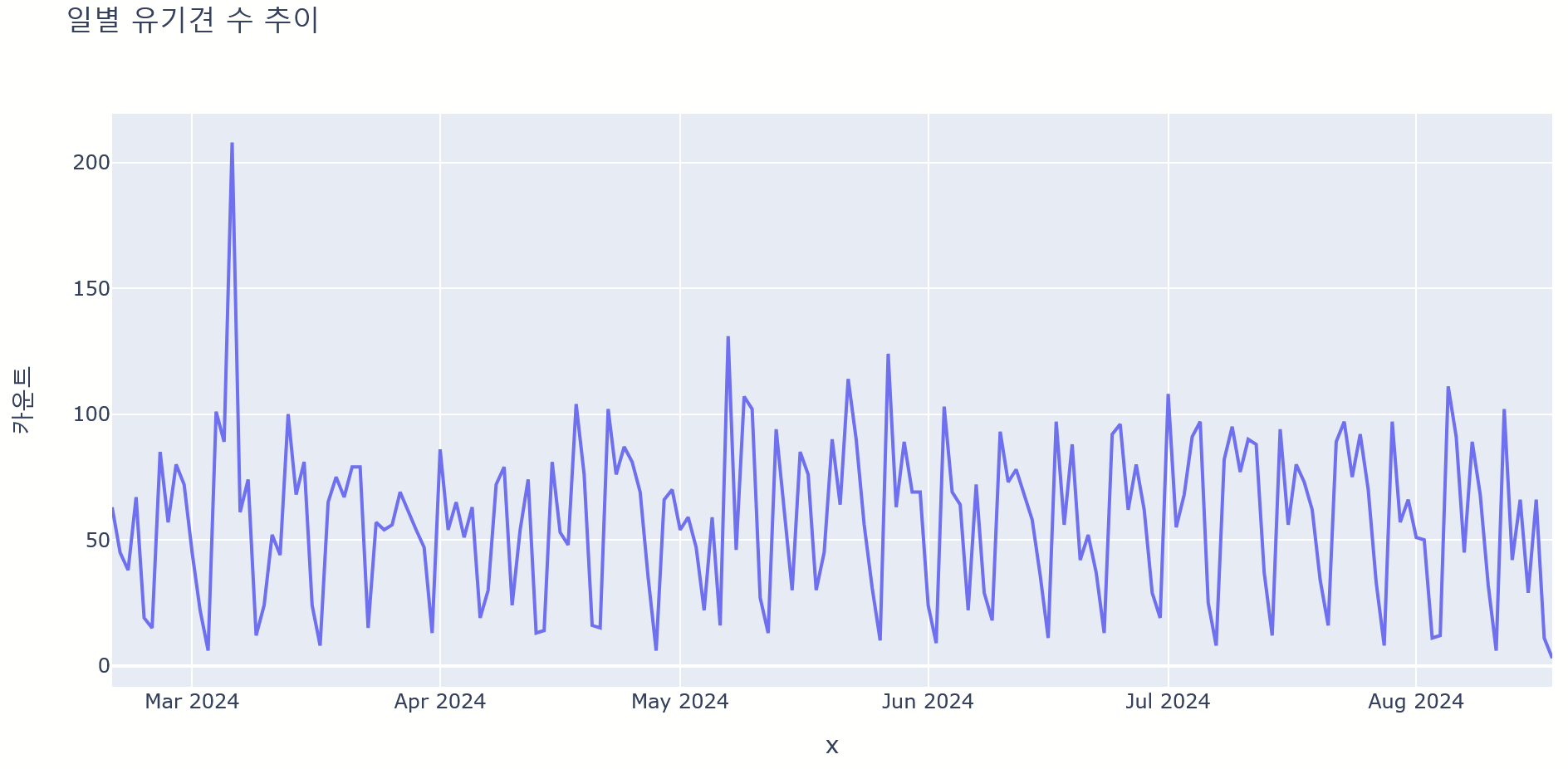 fig = px.line(data_frame=day, x= day['접수일자'].astype(str), y='카운트',title = '일별 유기견 수 추이')