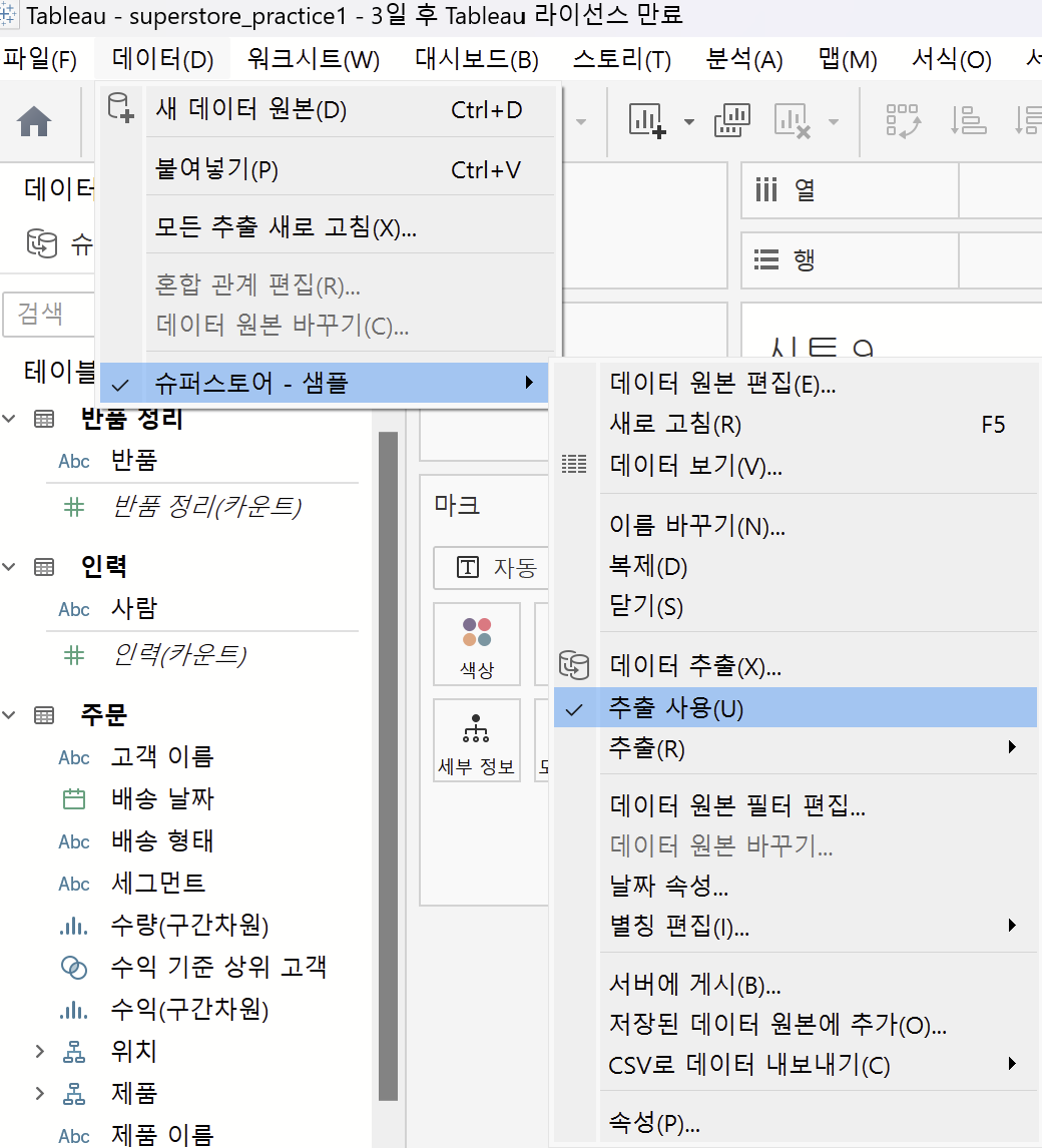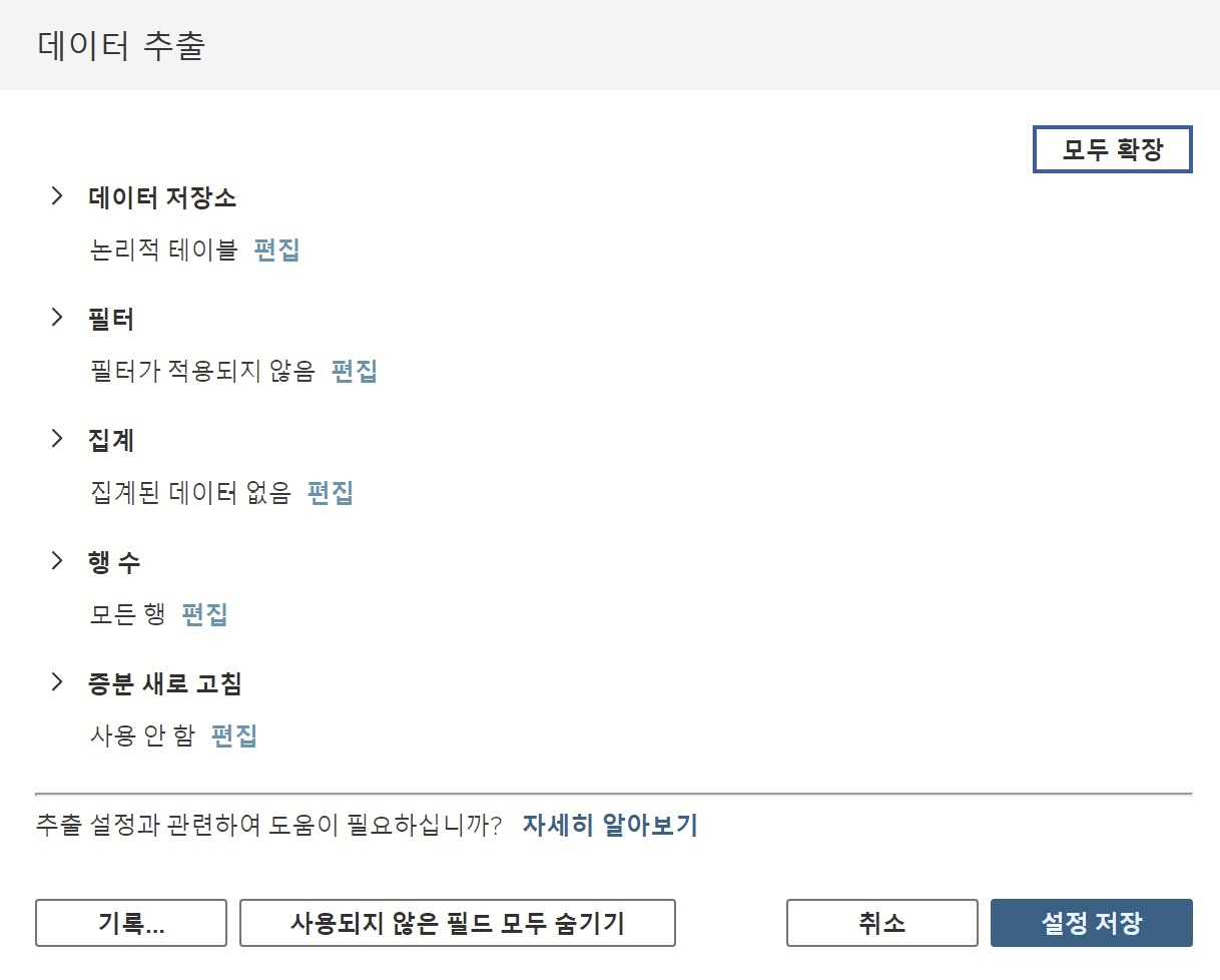 저장 후 다시 [데이터] 탭으로 가 연결된 데이터를 보면 추출 사용에 체크표시가 되어있을 것이다.