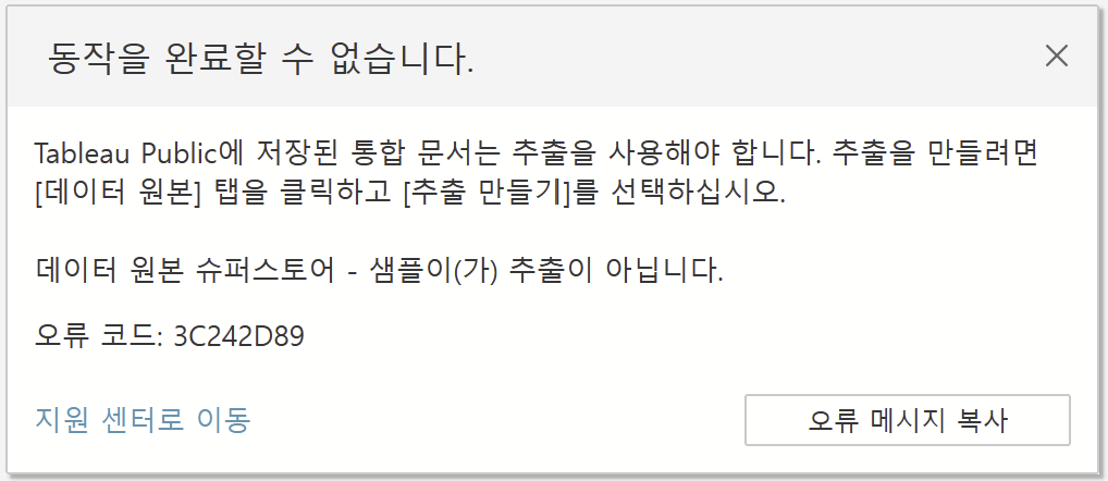 오류가 생긴 원인은 태블로 퍼블릭이 라이브 데이터 연결을 지원하지 않고, 추출 데이터만 사용할 수 있기 때문에 발생한 것이다. (라이브 데이터: 태블로에서 실시간으로 데이터베이스나 다른 데이터 소스에 직접 연결되어 데이터를 바로 가져오는 방식)