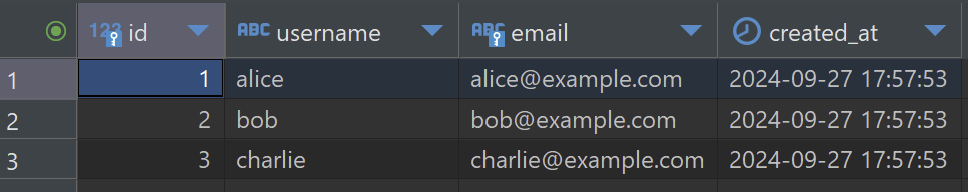 • created_at 컬럼의 경우 디폴트 값으로 데이터가 입력되는 그 시간을 받으니 입력하지 않아도 된다.